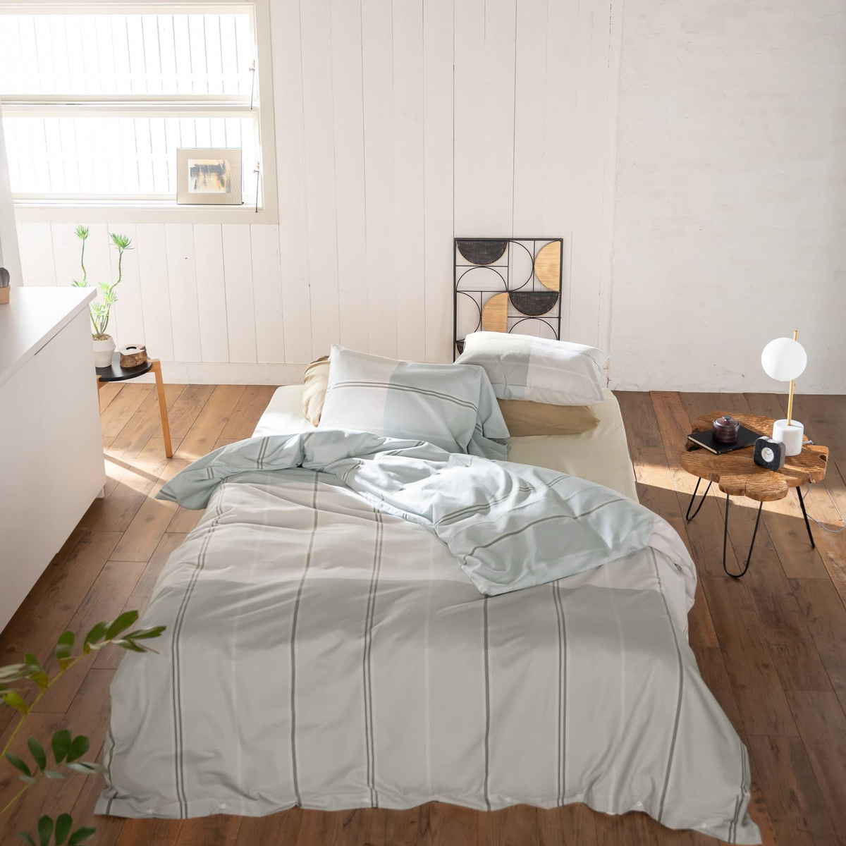 同じヴィスタシリーズで揃えることで、統一感のある落ち着いた寝室を演出できます。やさしい色合いのボーダーデザインが空間に心地よいアクセントを添え、穏やかな雰囲気の寝室づくりにおすすめです。