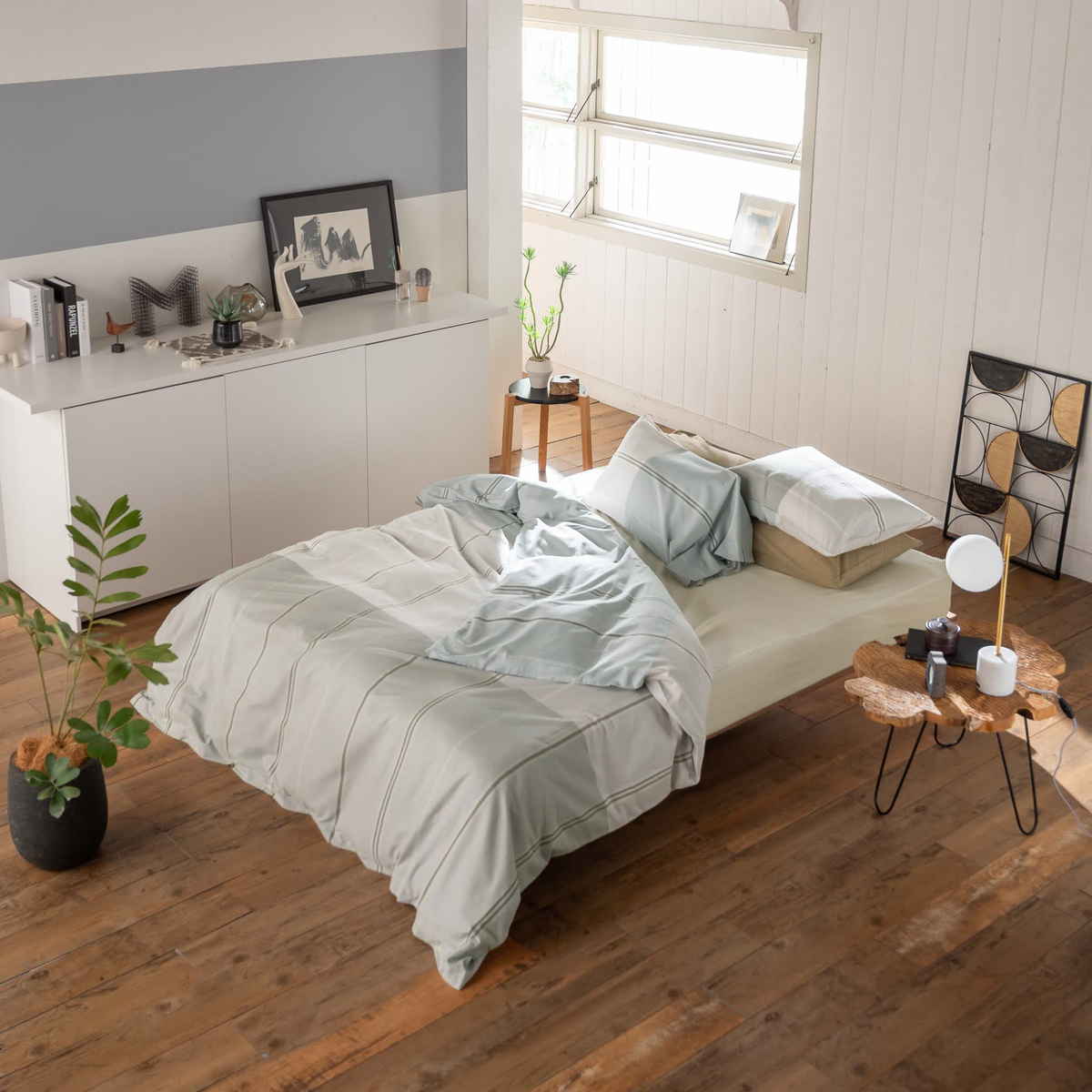 同じヴィスタシリーズで揃えることで、統一感のある落ち着いた寝室を演出できます。やさしい色合いのボーダーデザインが空間に心地よいアクセントを添え、穏やかな雰囲気の寝室づくりにおすすめです。