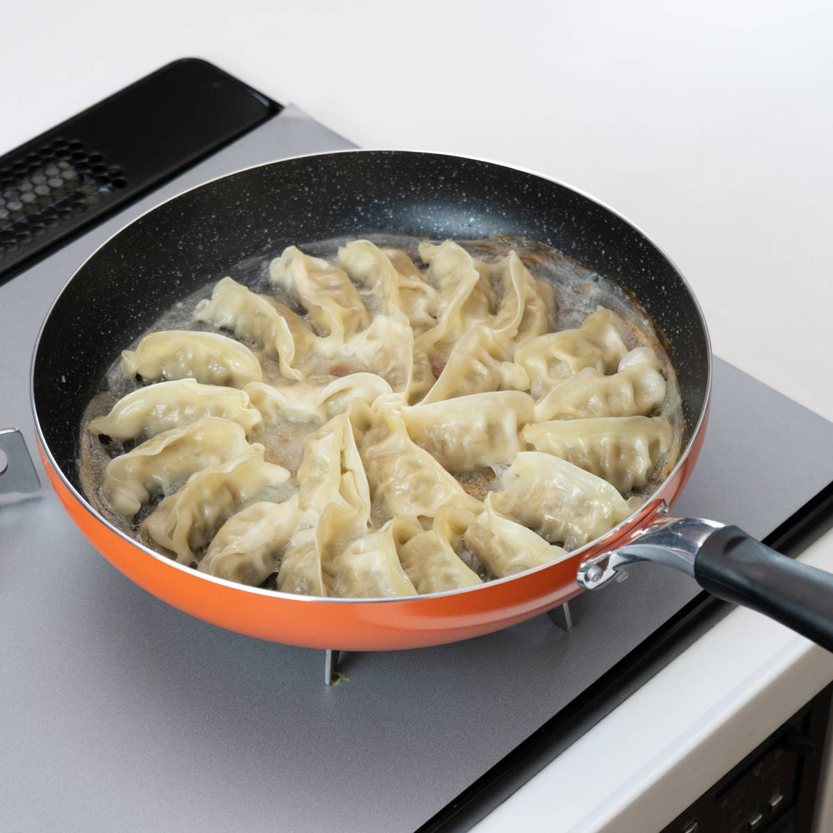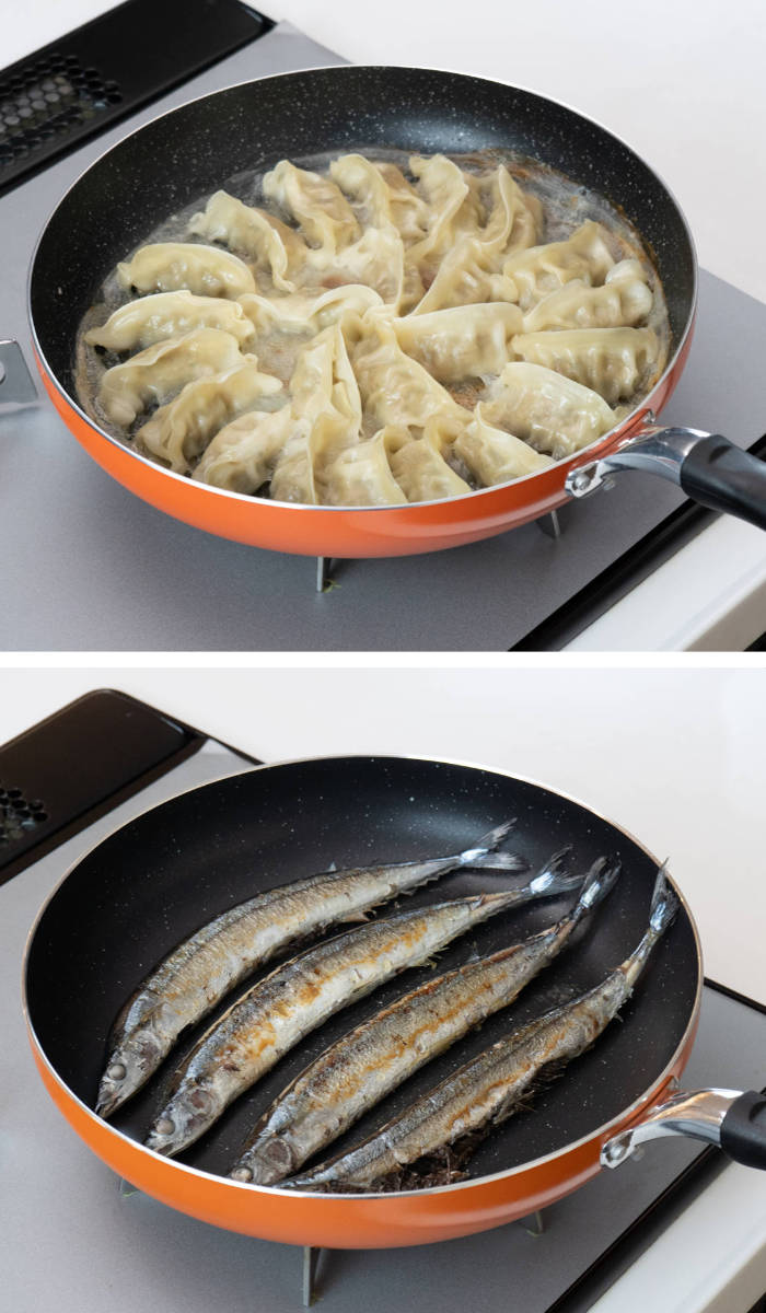 直径30cmの広い調理面で、食材をゆったり並べて調理できます。餃子なら一度に約24個焼くことができ、家族分の調理もスムーズです。さんまなど長さのある魚もそのまま焼きやすく、大きな食材の調理にも便利です。