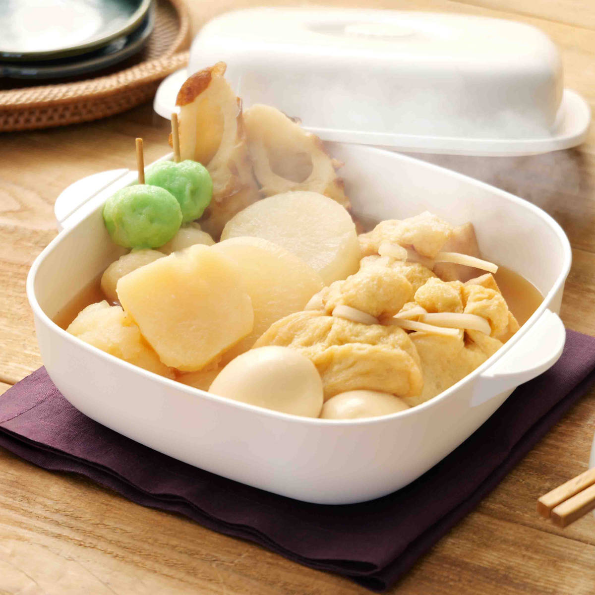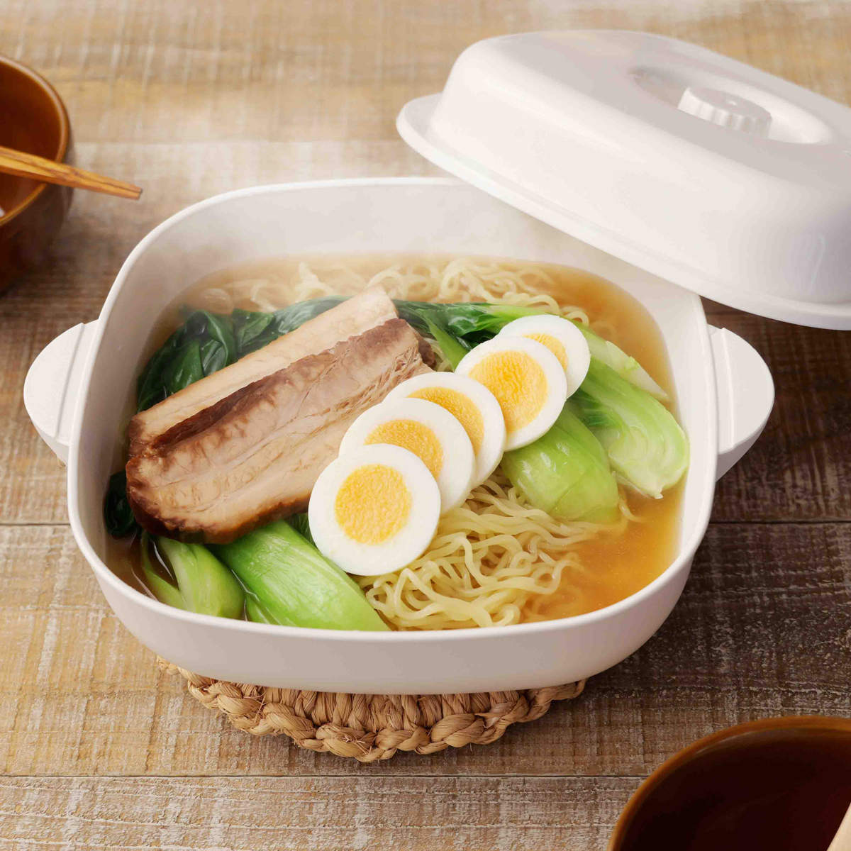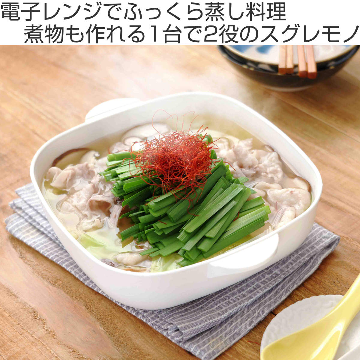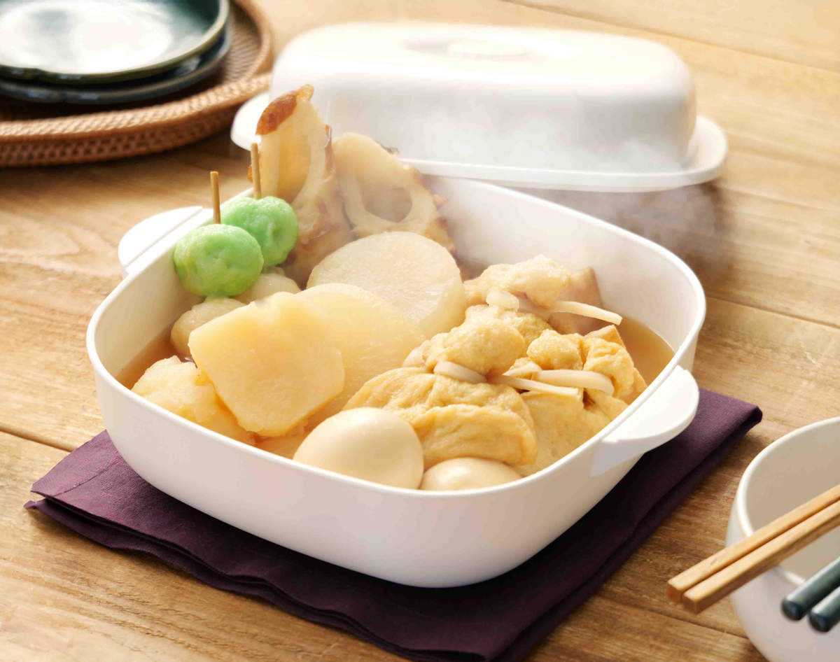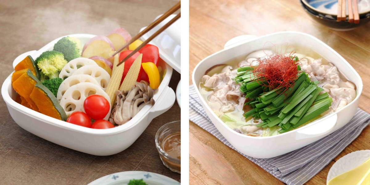ラーメン、おでん、もつ鍋など電子レンジで簡単・時短調理が可能です。完成後はそのまま食卓へ出せます。