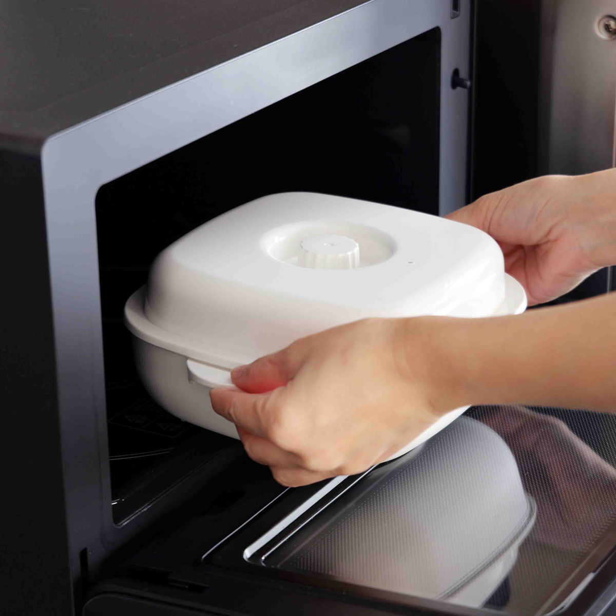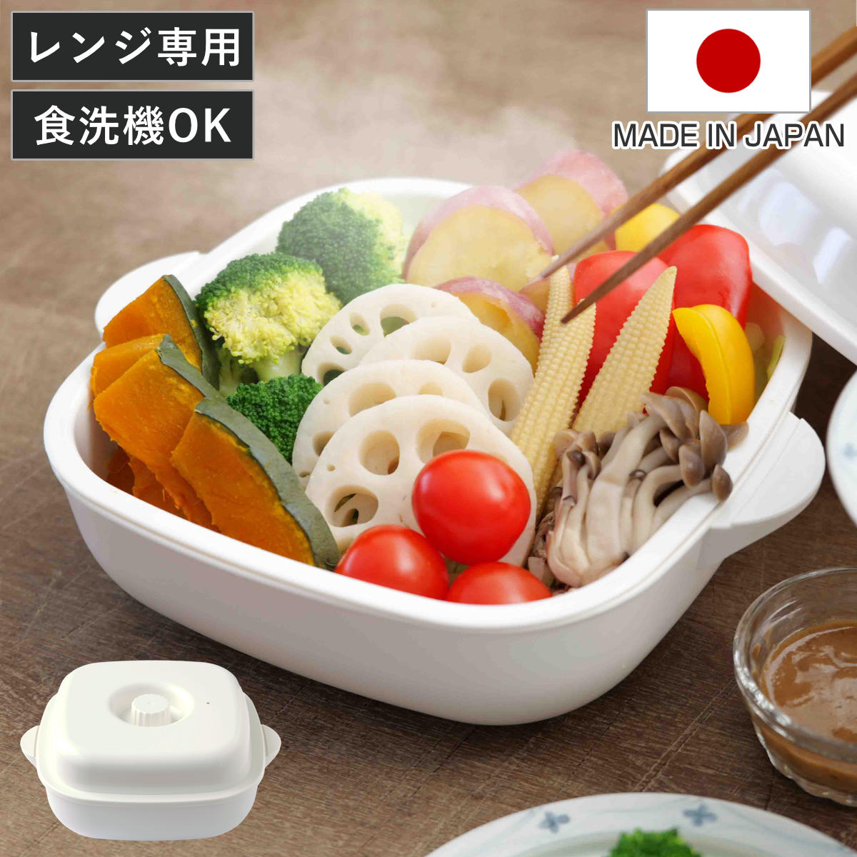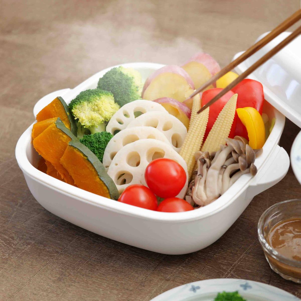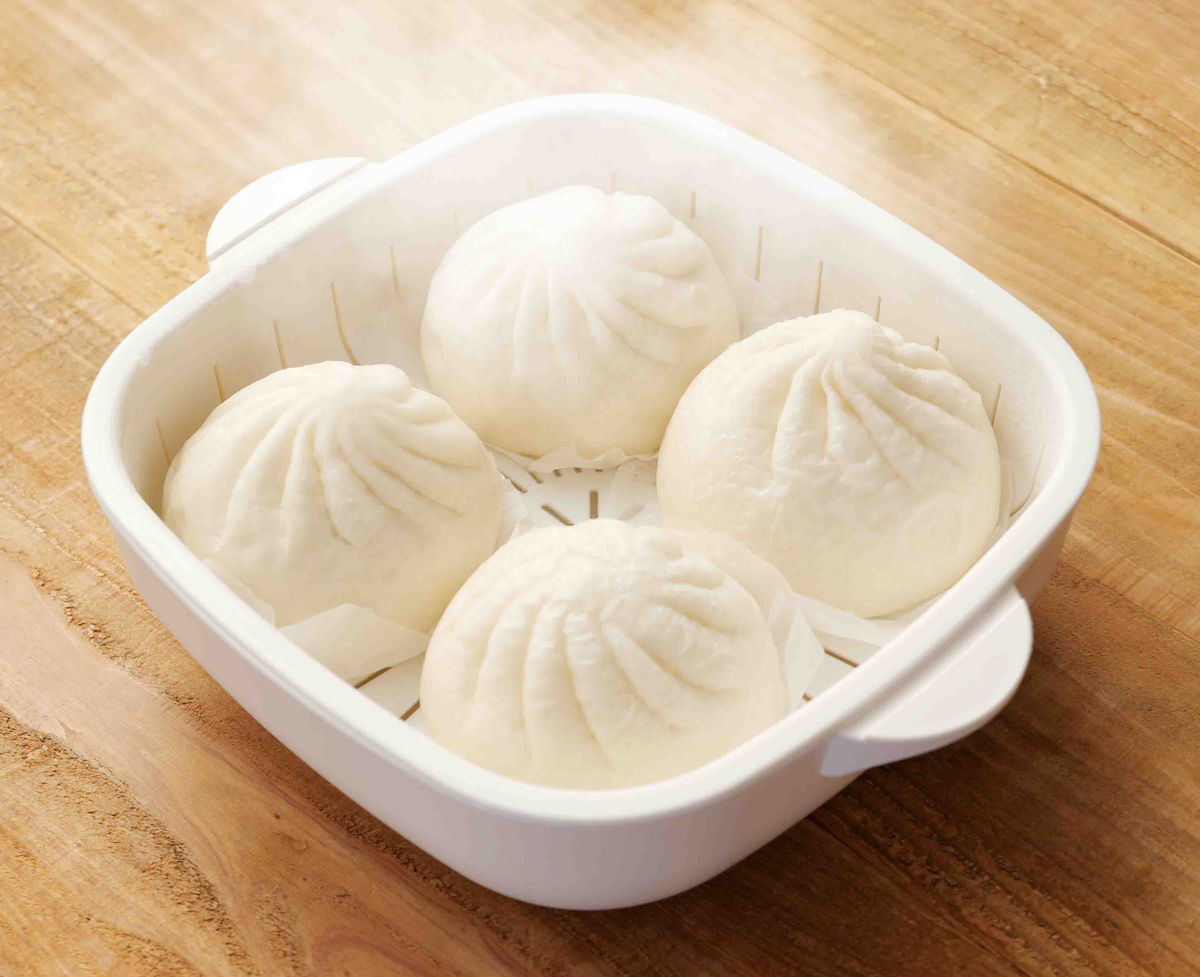 温野菜、肉まん、蒸し鶏など電子レンジで加熱するだけで簡単に調理できます。底からも横からも蒸気が巡る循環スチームでムラなくふっくら温めます。