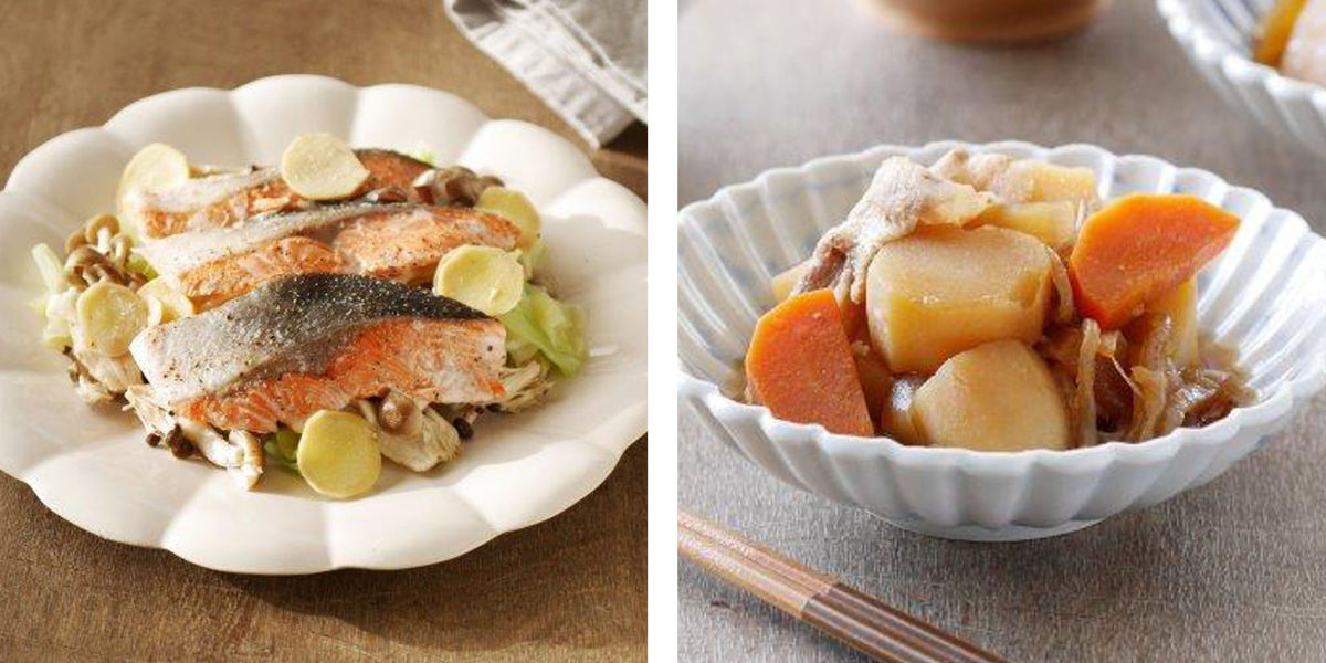 肉じゃが、ニラ鍋、鮭とキャベツの生姜蒸し、おでん、塩蒸し鶏のレシピが付属しています。電子レンジで簡単にアレンジレシピをお楽しみいただけます。