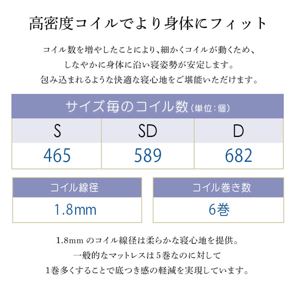 こだわりのポケットコイルマットレスを採用。厚さ約15cmで、体にやさしくフィットする設計です。682個のコイルがそれぞれ独立して体を点で支え、体のラインに合わせて自然に沈み込みます。就寝時でも直立時に近い自然な姿勢を保ちやすく、負担を抑えた快適な寝心地をサポートします。