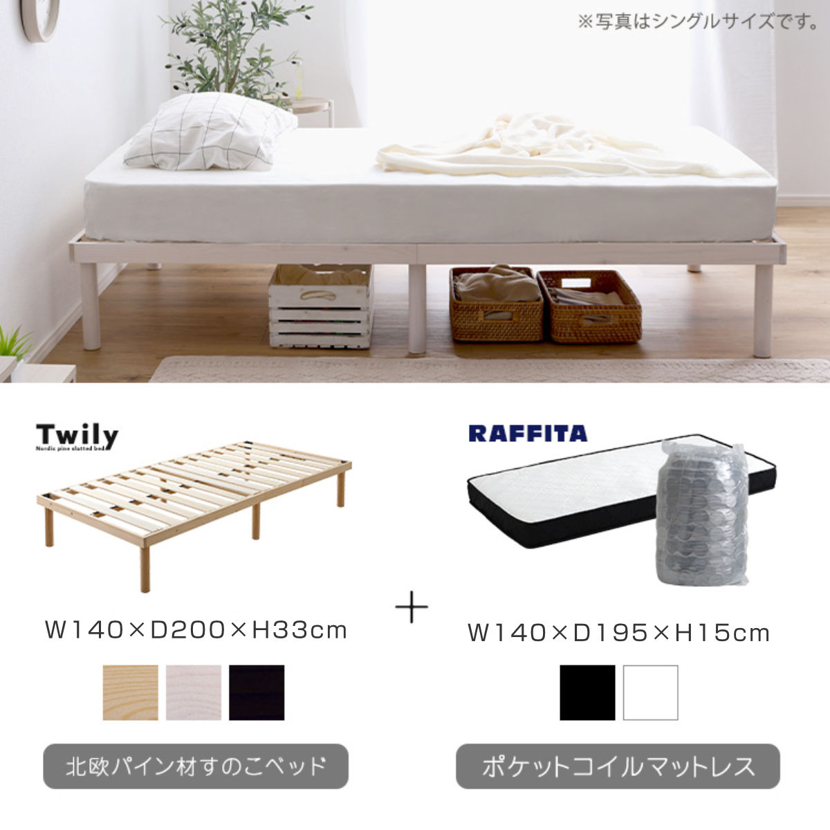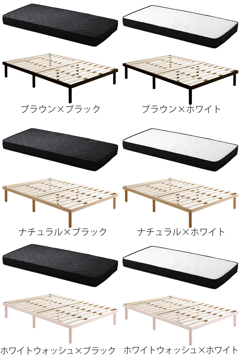 すのこベッド ダブル ポケットコイル マットレス付き 北欧パイン 天然木 耐荷重200kg ( ヘッドボードなし 2段階 高さ調節 ロータイプ ハイタイプ 低ホルムアルデヒド ベッドフレーム ブラウン ナチュラル ホワイトウォッシュ ) 【ホワイトウォッシュ×ブラック】