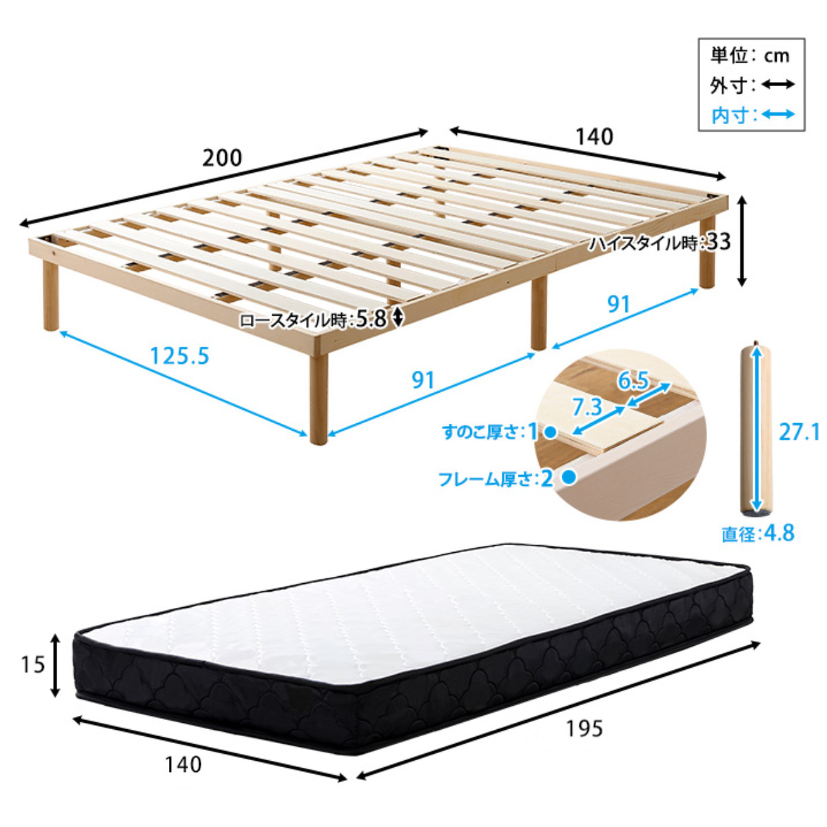 | サイズ | ベッド:約 幅140×奥行200×高さ33(cm) マットレス:約 幅140×奥行195×高さ15(cm) |