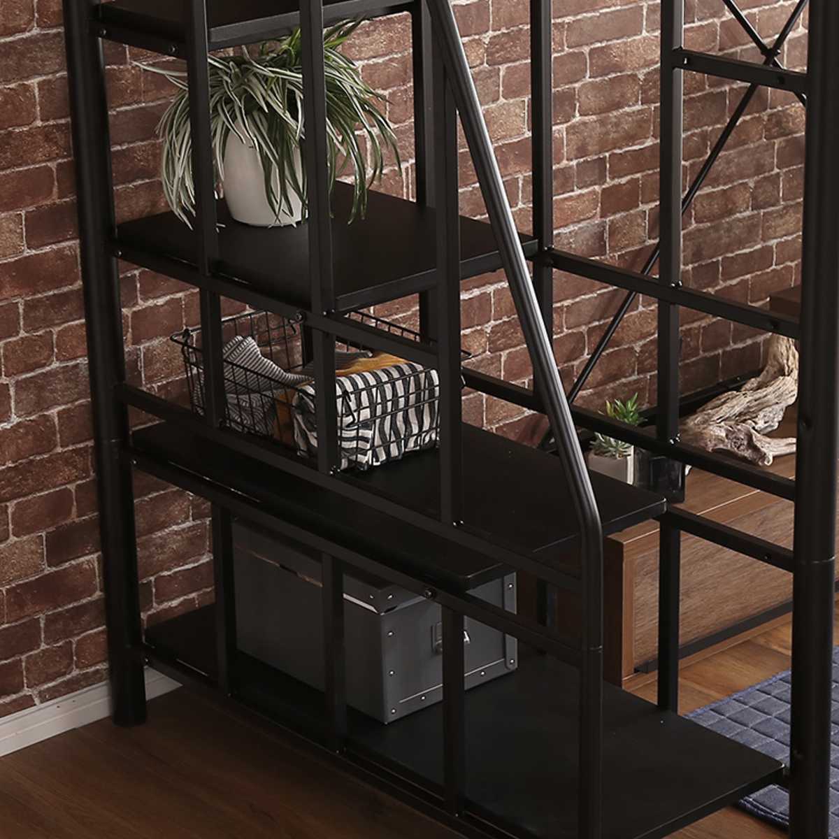 ロフトベッド シングル 階段付き メッシュ 宮棚付き ( ベッド 棚付き コンセント付き 高さ調節 ロフト シングルベッド 耐荷重120kg ハンガーパイプ付 収納 2way ) 【ブラック】