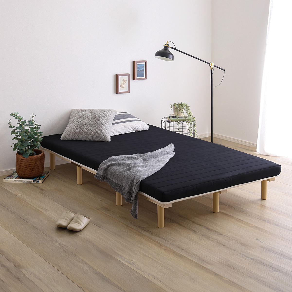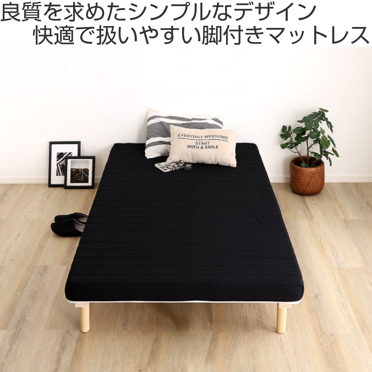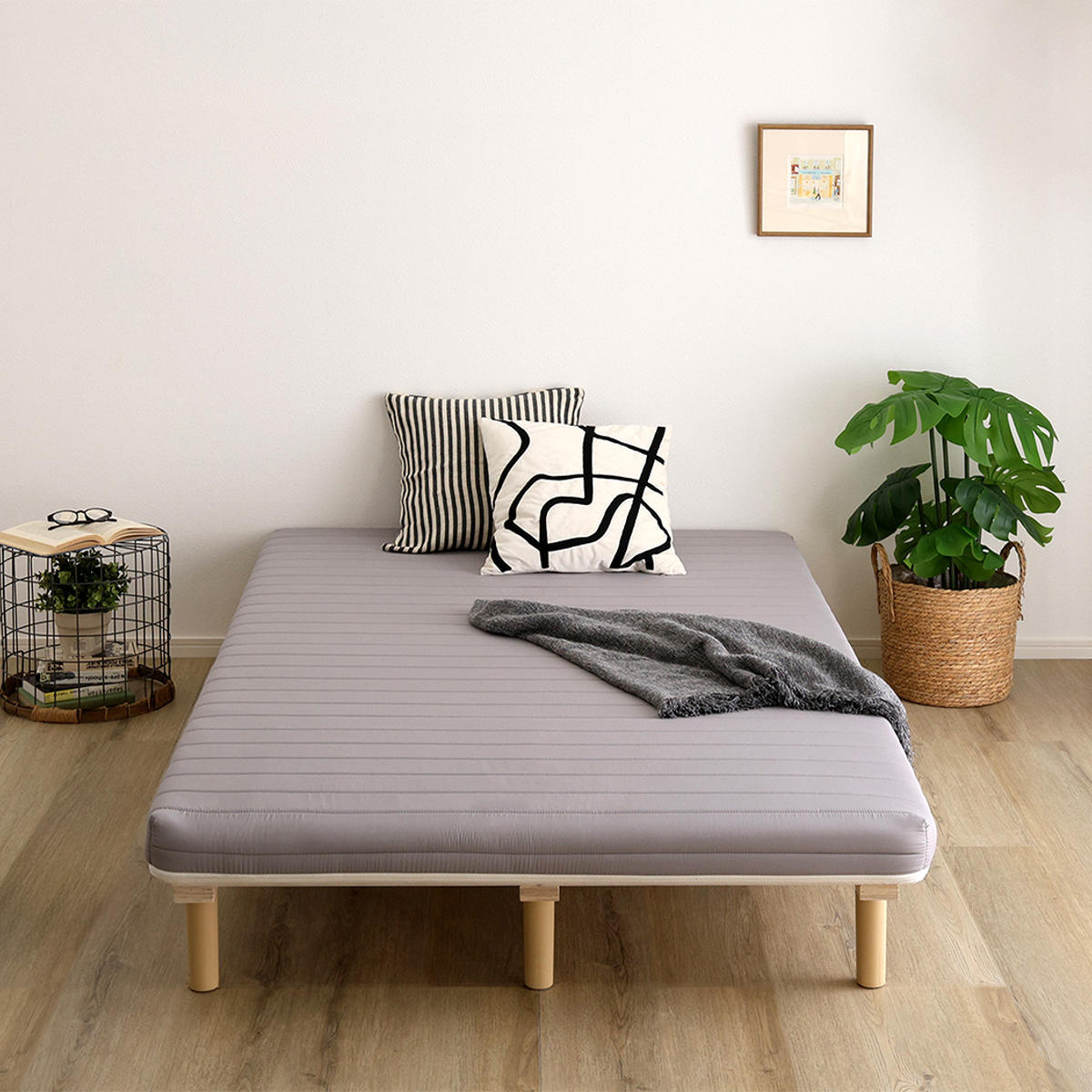 継ぎ目のない、一体型の脚付きマットレスです。良質なマットレスと通気性の良いすのこベッドを一体化した、シンプルに暮らしたい人にぴったりなミニマルデザインです。フレームがないシンプルな構造なので、場所を取らずに設置できます。