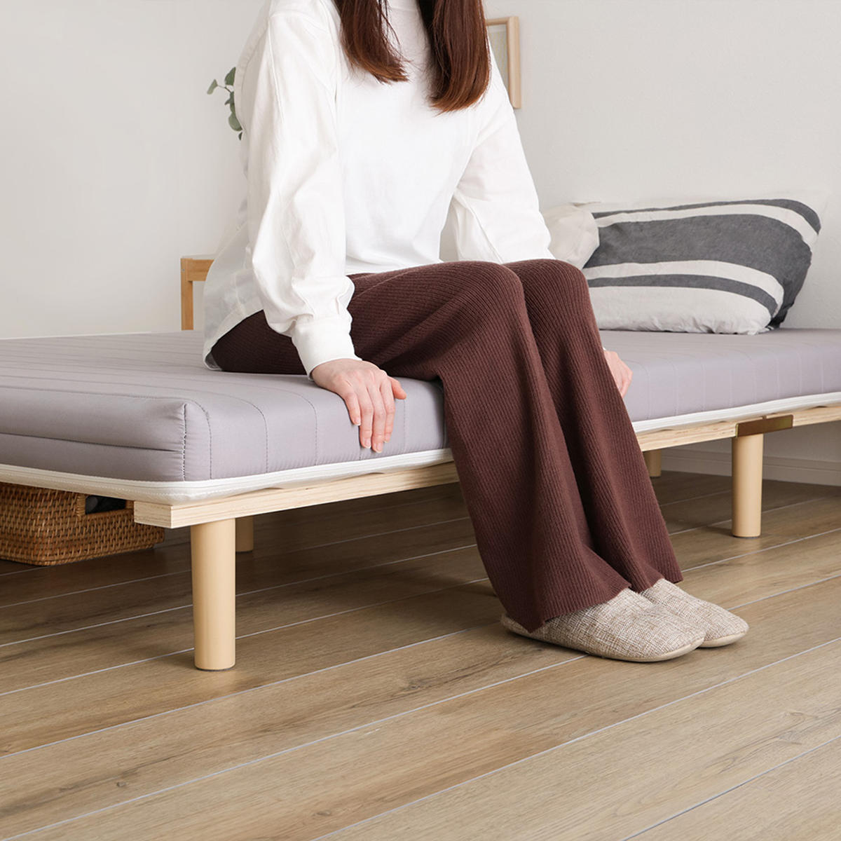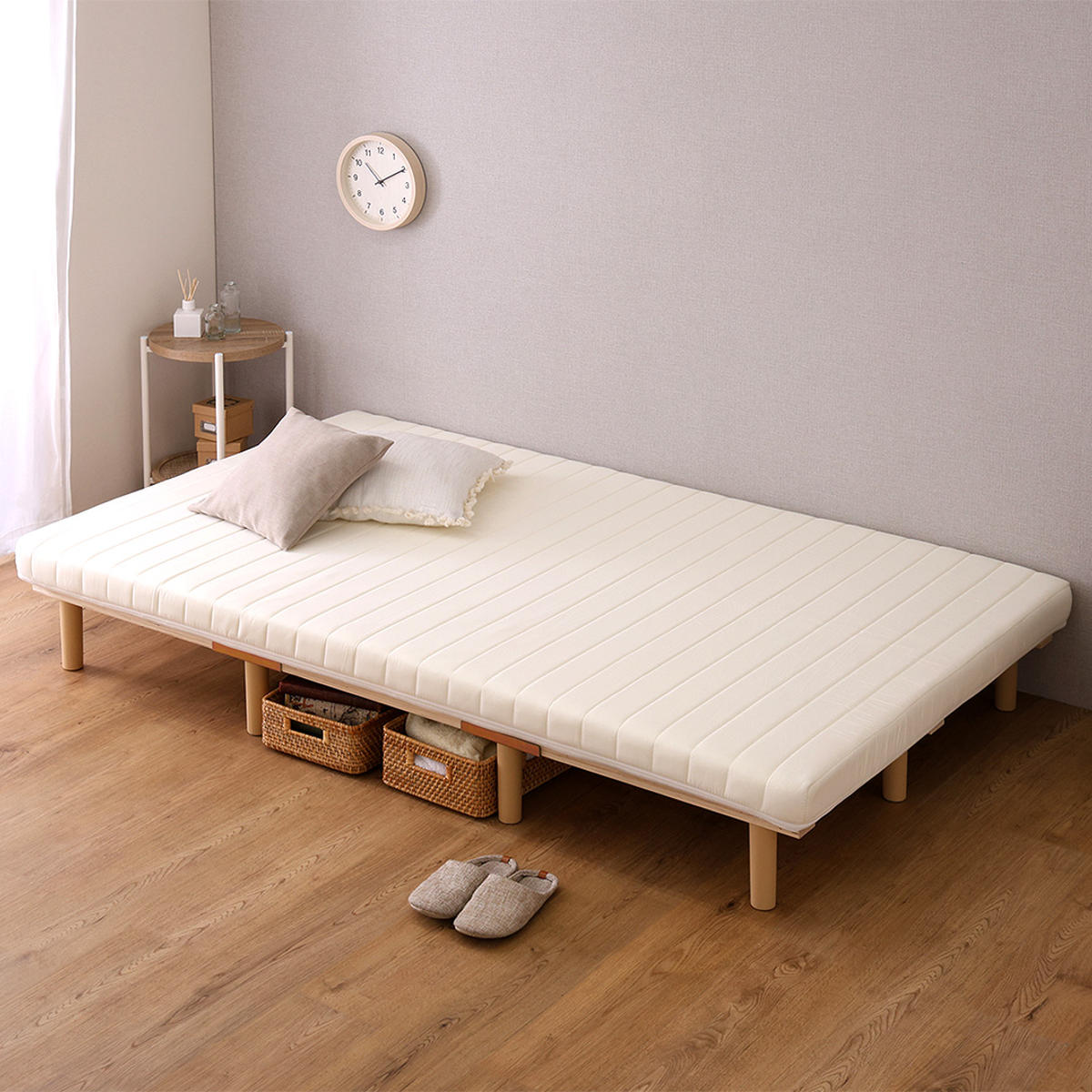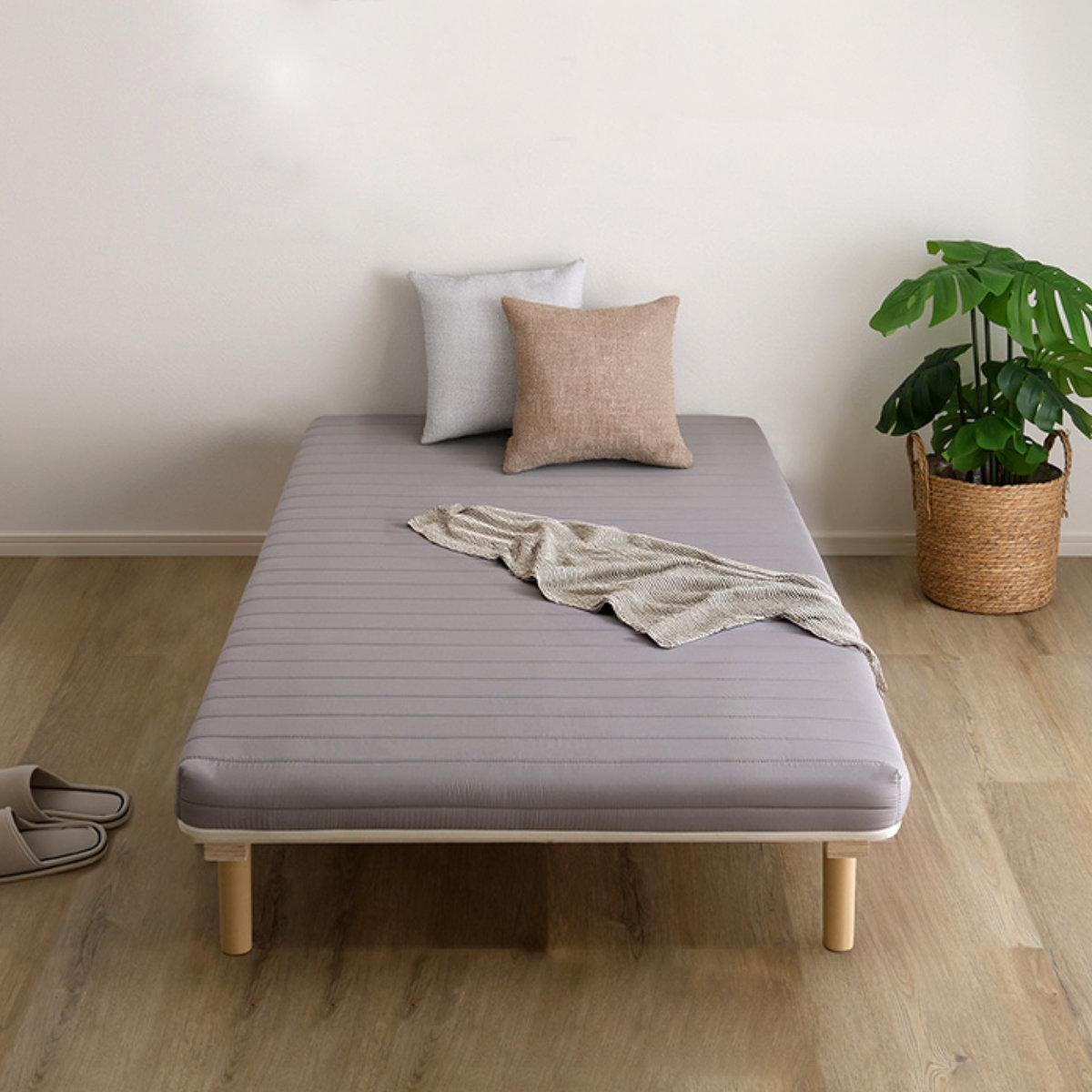 継ぎ目のない、一体型の脚付きマットレスです。良質なマットレスと通気性の良いすのこベッドを一体化した、シンプルに暮らしたい人にぴったりなミニマルデザインです。フレームがないシンプルな構造なので、場所を取らずに設置できます。