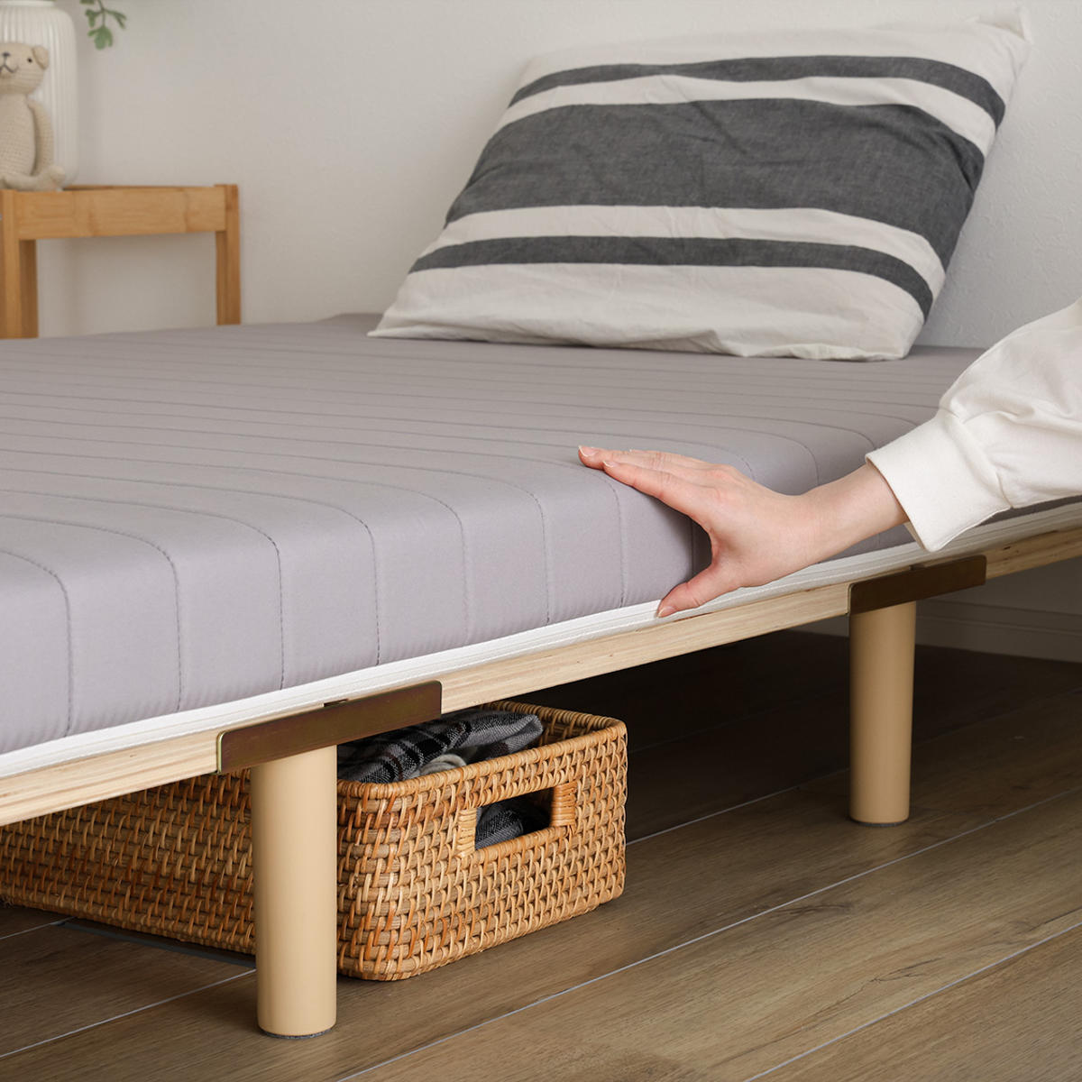 マットレス下部は、LVL材を横板としてすのこ状に配置。強度を保ちつつ、隙間から風を通しムレを防ぎます。すのこにフレームをボルトでしっかり固定した頑丈設計で、セミシングルの耐荷重は120kgです。耐久性と安定感のある、心地よい眠りをサポートします。