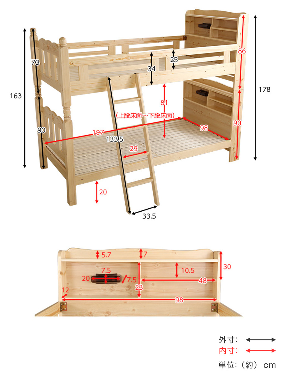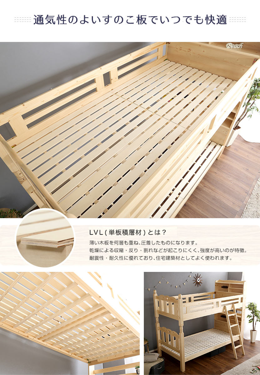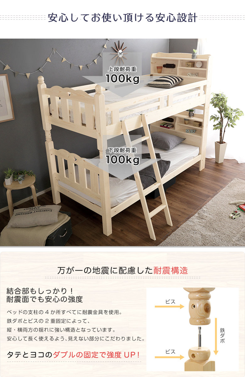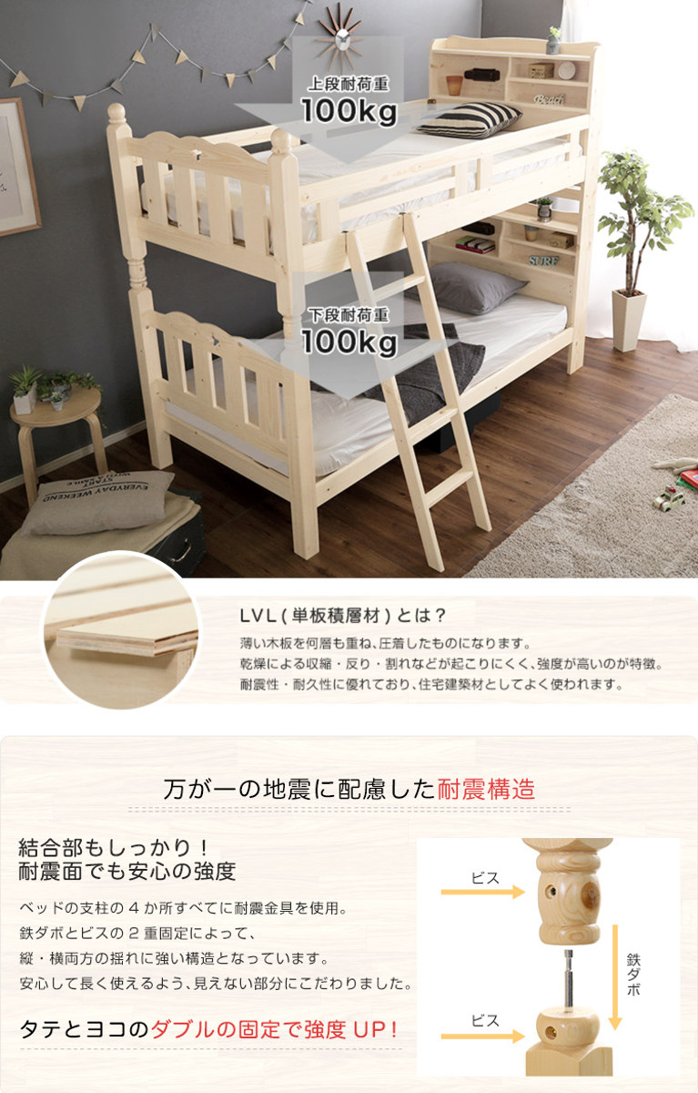 床板にはLVL(単板積層材)を採用し、耐震性・耐久性に優れた頑丈な構造に仕上げました。上下段それぞれ耐荷重100kgの安心設計で、お子さまにも安心してお使いいただけます。
