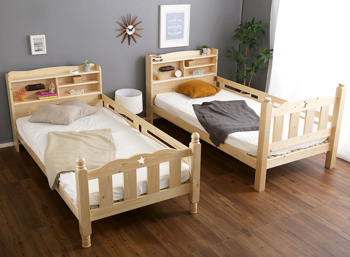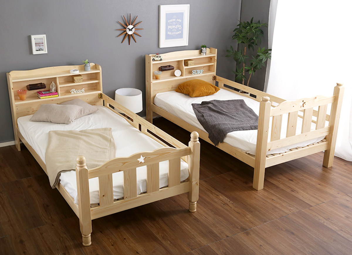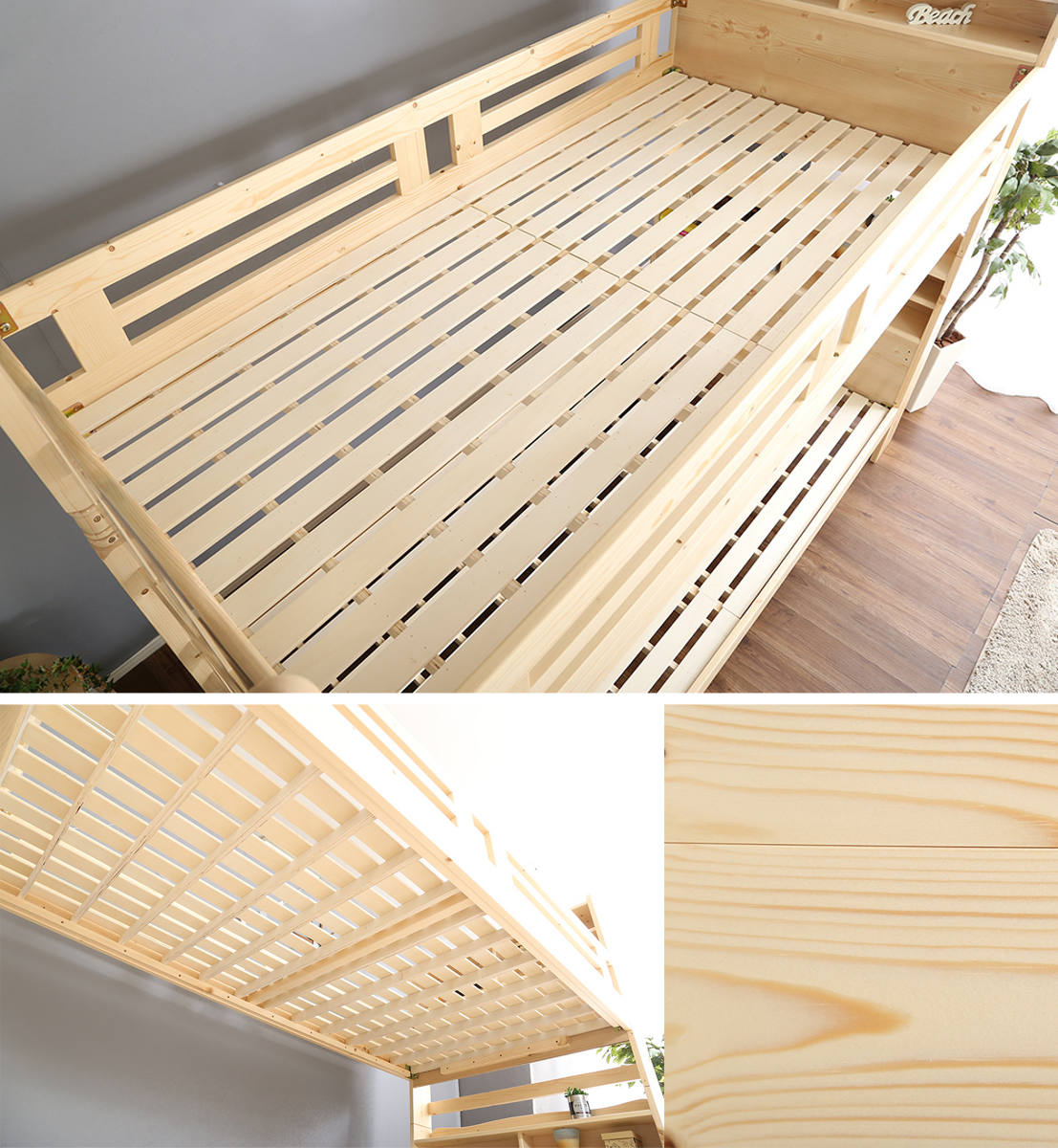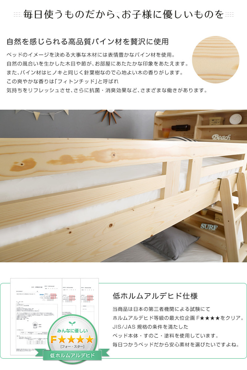 ベッドには自然のぬくもりを感じられる高品質なパイン材を使用。木目や節を生かした風合いが、お部屋にあたたかな印象を与えます。パイン材の爽やかな香りは「フィトンチッド」と呼ばれ、リフレッシュ効果や抗菌・消臭効果があるといわれています。