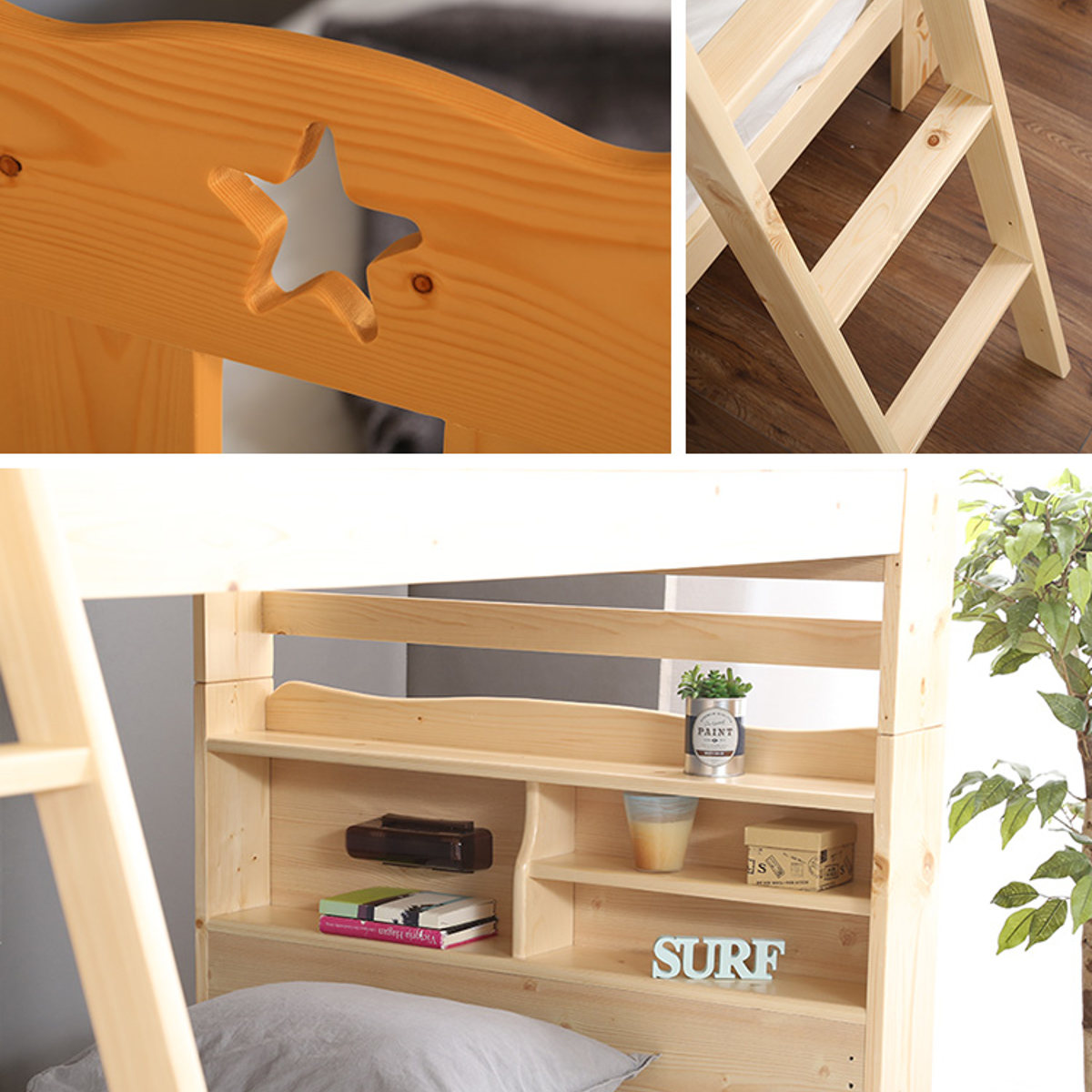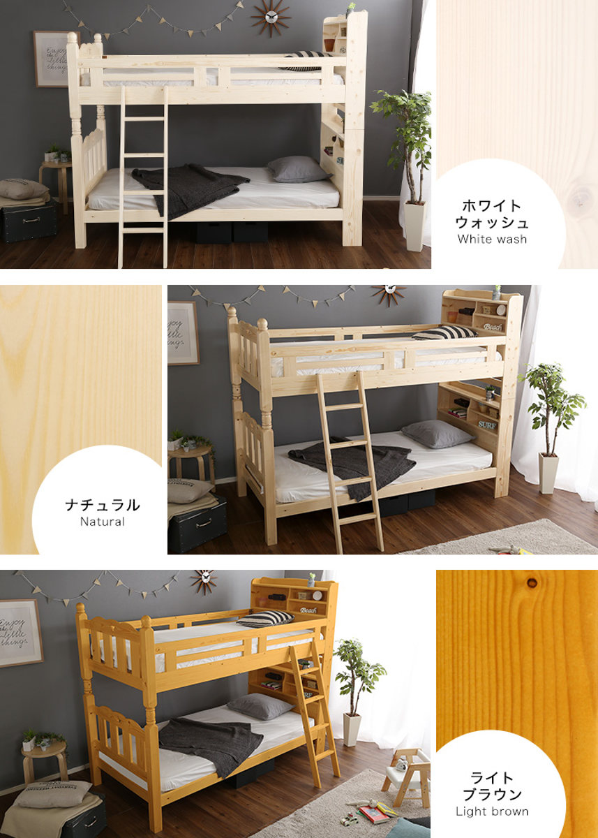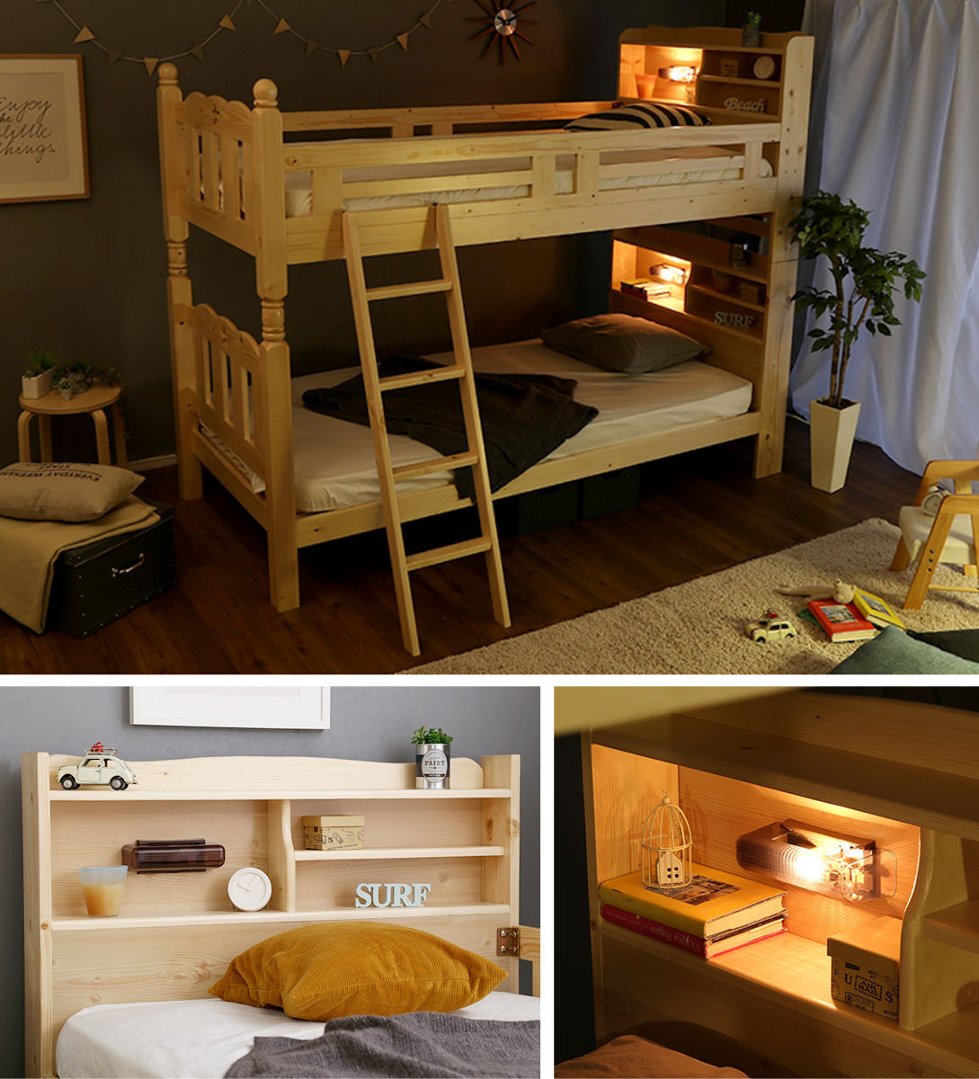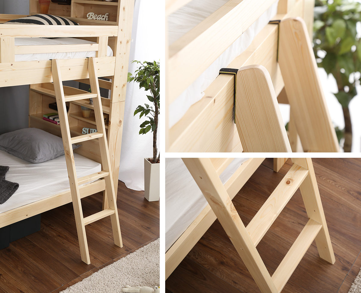 本や目覚まし時計などを置ける便利な宮棚付き。手元をやさしく照らす照明が付いているので、夜中の起き上がりやハシゴの昇り降りも安心して行えます。