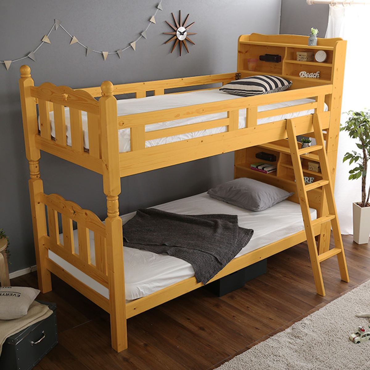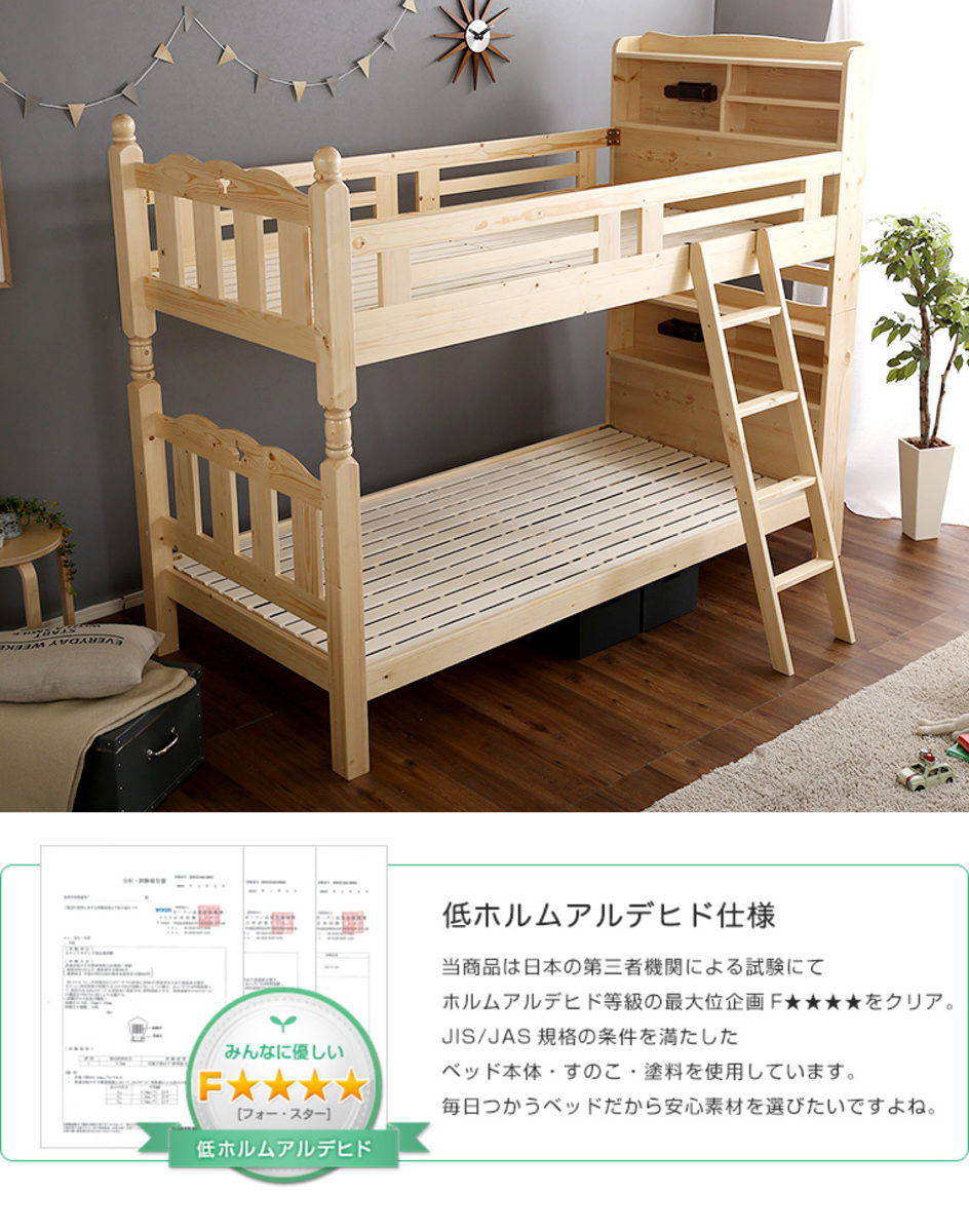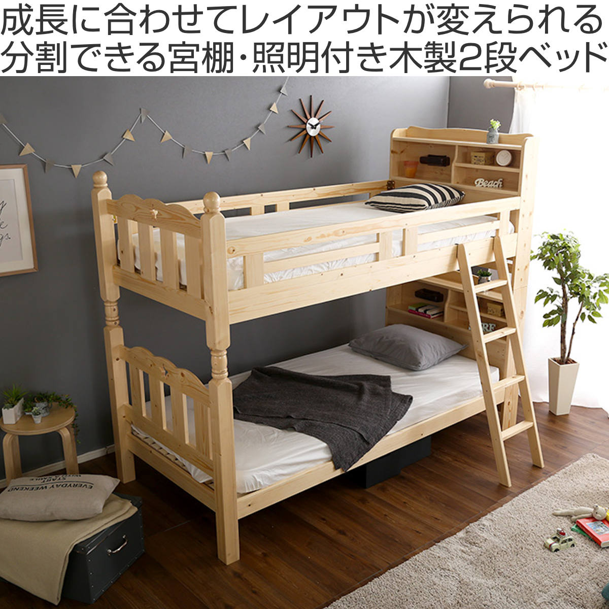 宮棚・照明付き木製2段ベッド