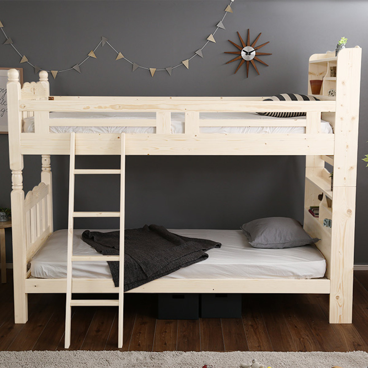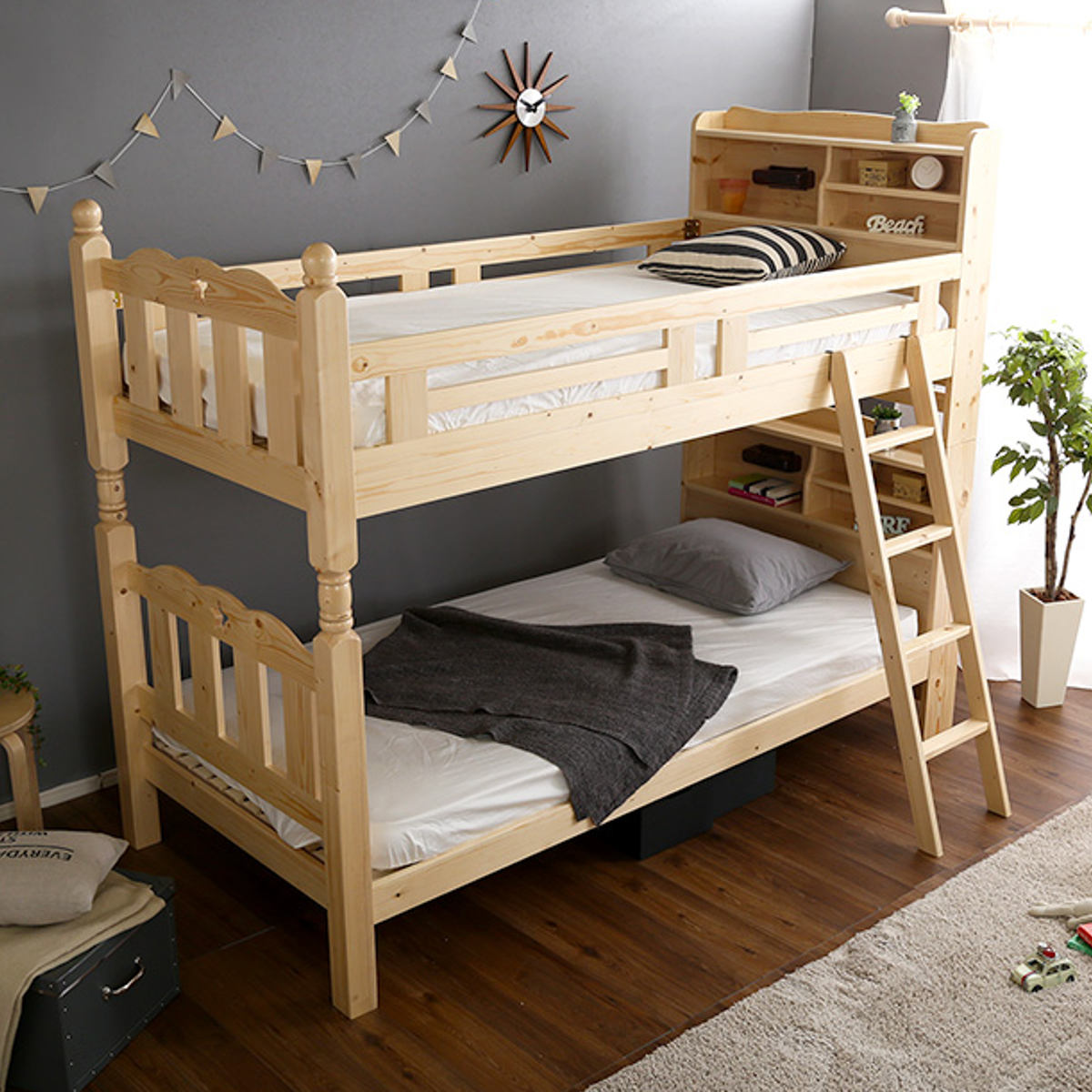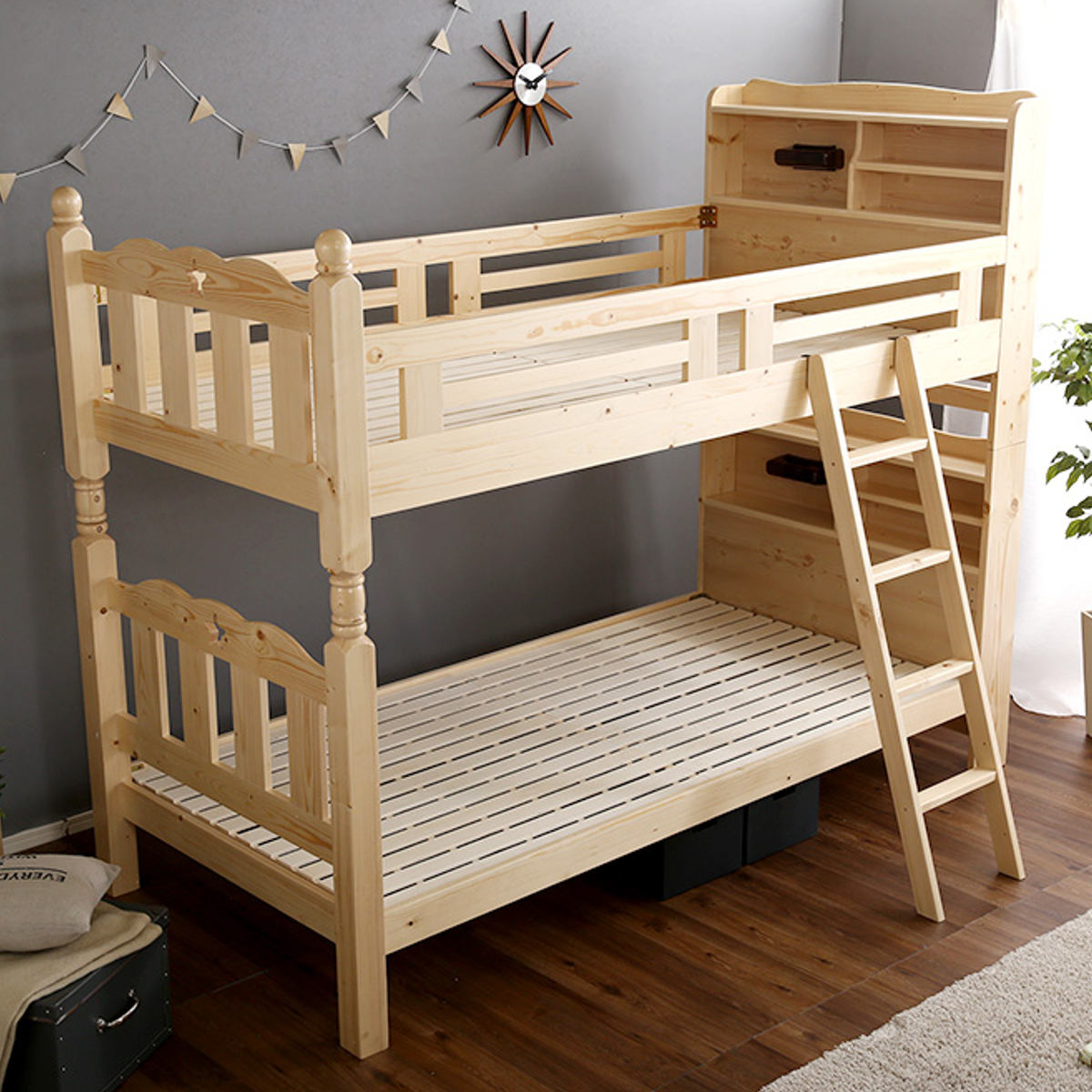 宮棚・照明付き木製2段ベッド