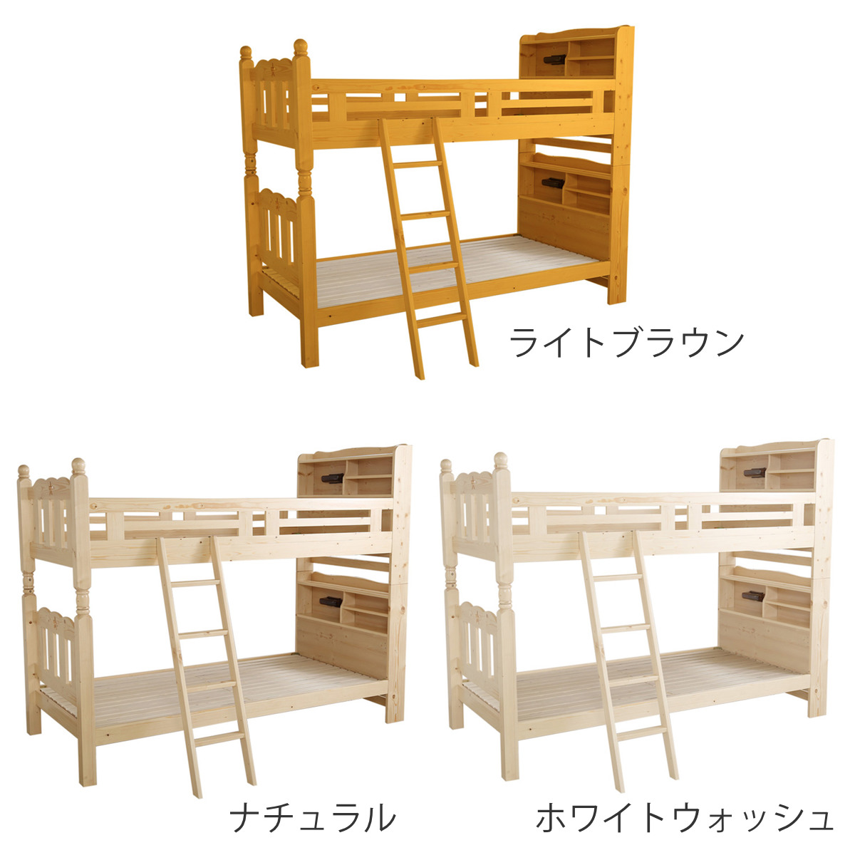 すのこ2段ベッド 照明付き宮棚 分割可能 シングル F★★★★ ( ベッド 2段 分割OK 宮棚付き すのこ 天然木 木製 ハシゴ 低ホルムアルデヒド ライト付き ライトブラウン ナチュラル ホワイトウォッシュ ) 【ホワイトウォッシュ】
