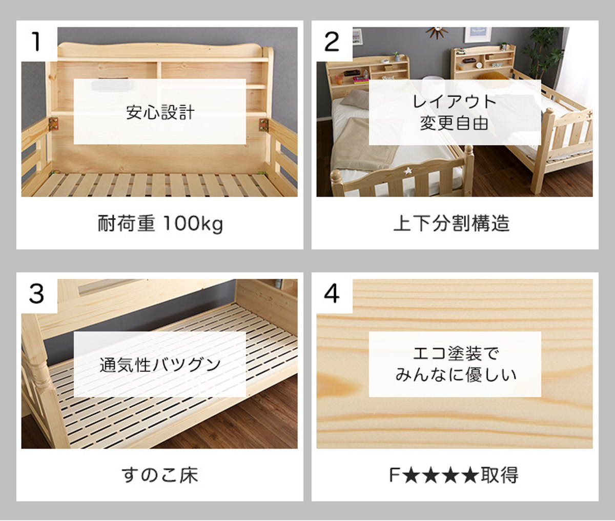 シックハウス対策基準の最上位規格である『F★★★★(エフフォースター)』をクリアした、低ホルムアルデヒド仕様のベッドです。ホルムアルデヒドの放散量を抑えた素材を使用しているため、小さなお子様にもやさしく安心してお使いいただけます。毎日長く使うベッドだからこそ、安全性にも配慮しました。