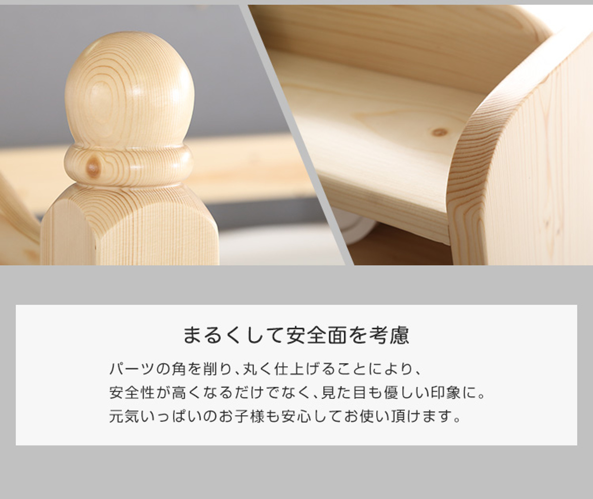 パーツの角は丁寧に面取りした丸みのあるやさしい仕上がりで、小さなお子様にも配慮した安心設計です。触れたときにもなめらかな手触りで、安全性はもちろん見た目にもやわらかな印象を与えます。