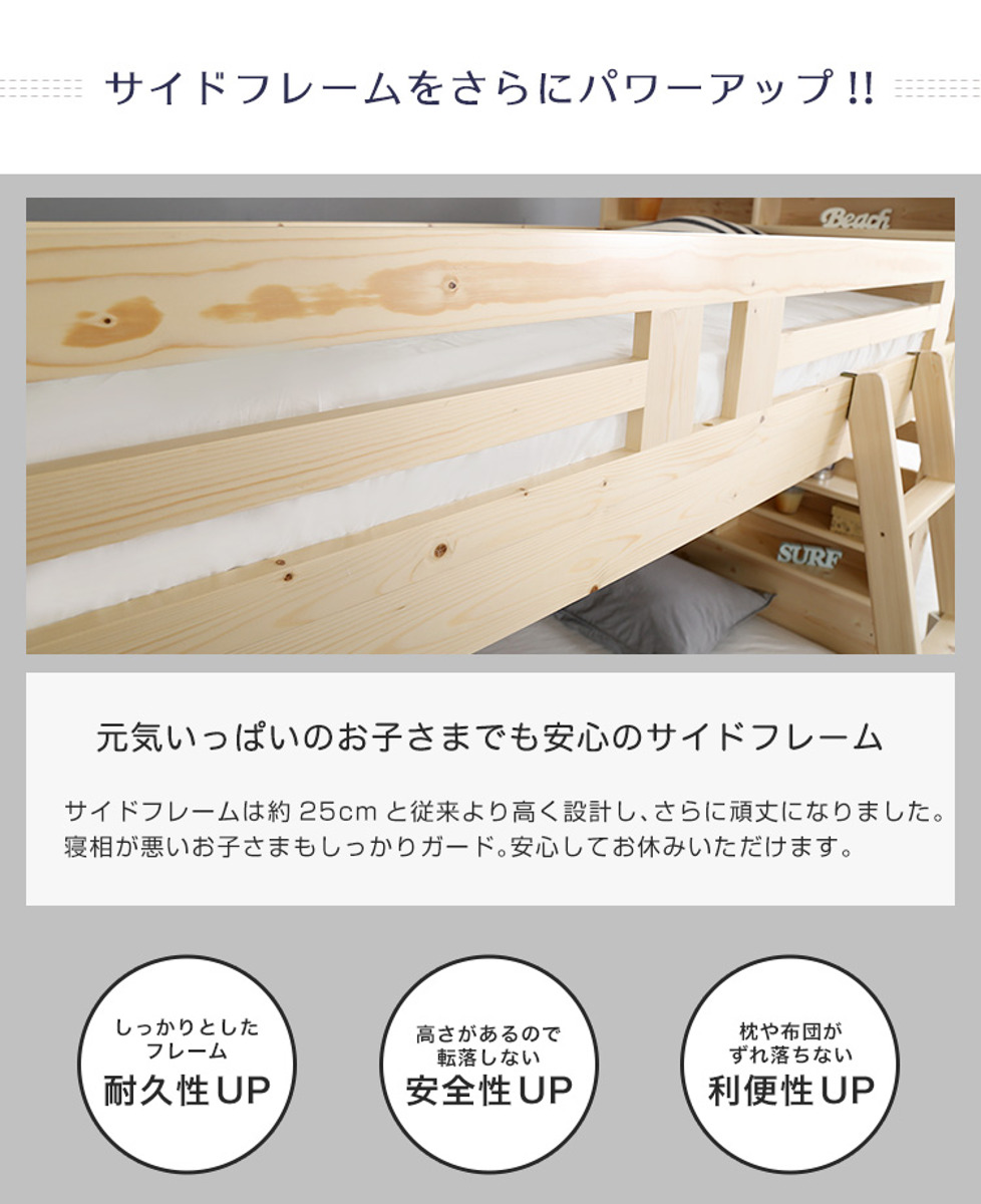 高さ約25cmのサイドフレームを採用し、従来よりもしっかりとした安心設計に仕上げました。寝返りによる落下を防ぎ、寝相が気になるお子様でも安心してお休みいただけます。枕や布団のずれ落ちも防ぎ、気持ちよくお休みいただけます。