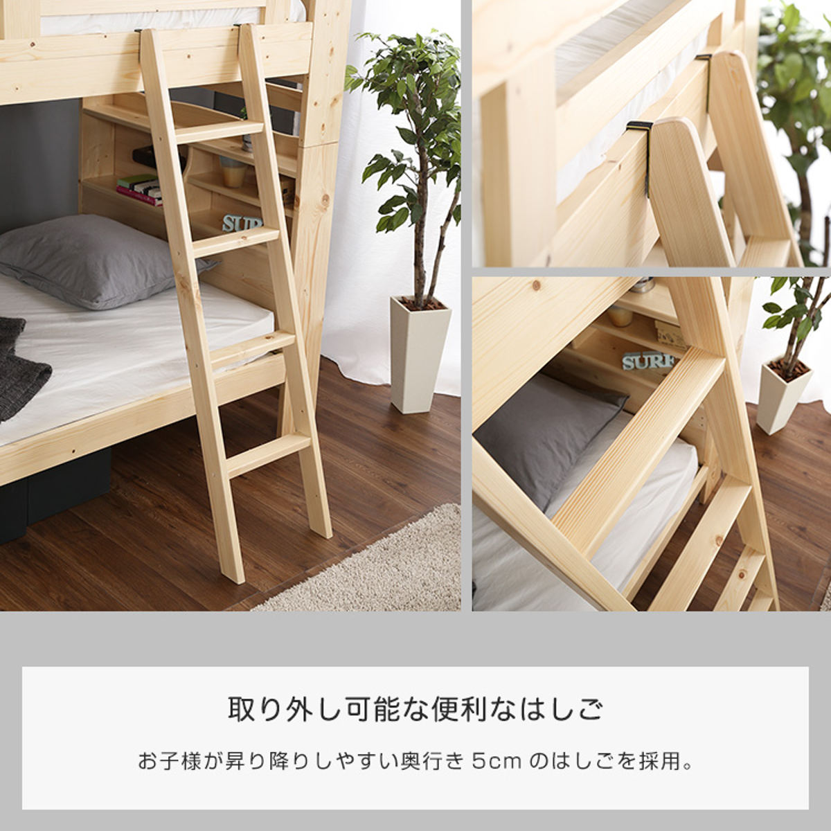 ハシゴは取り外し可能で、レイアウトや使い方に合わせて柔軟に設置できます。踏板の奥行を約5cmに設定しているため足裏が痛くなりにくく、小さなお子様でも安心して昇り降りできます。