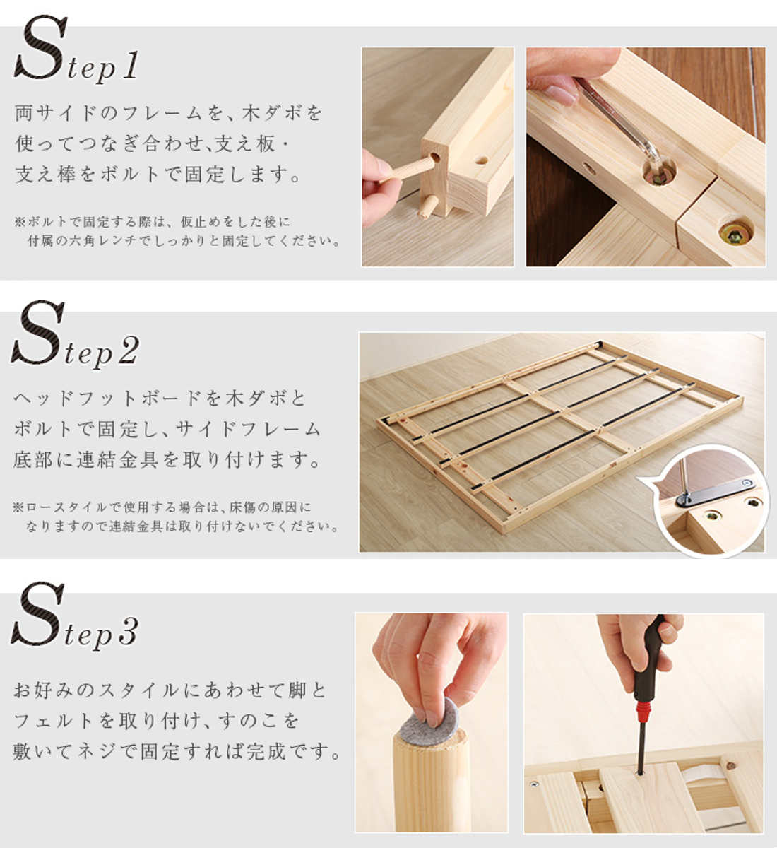 | 内容量 | ダブルベッド:1台 ダブルマットレス:1台 付属品:床傷防止用フェルト |