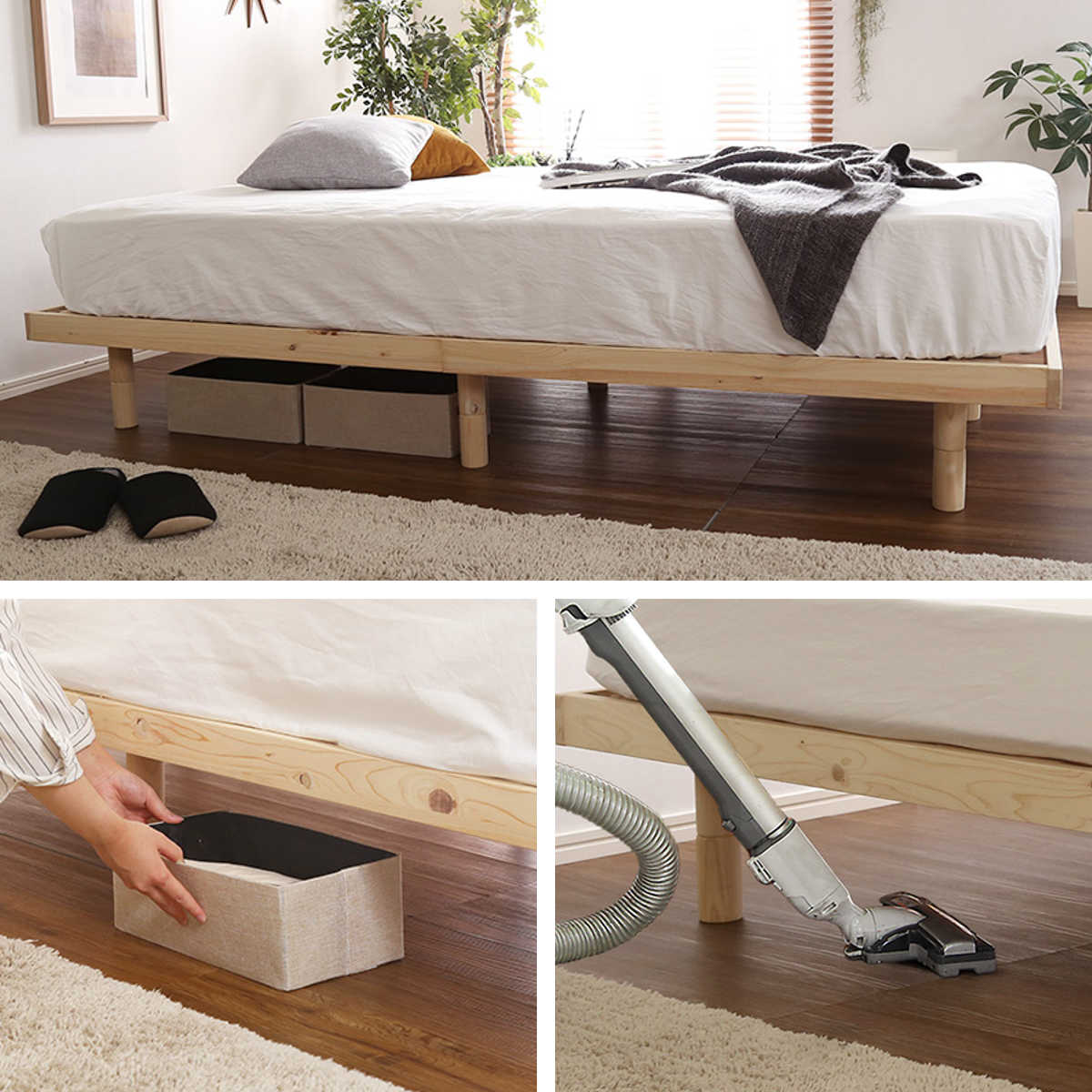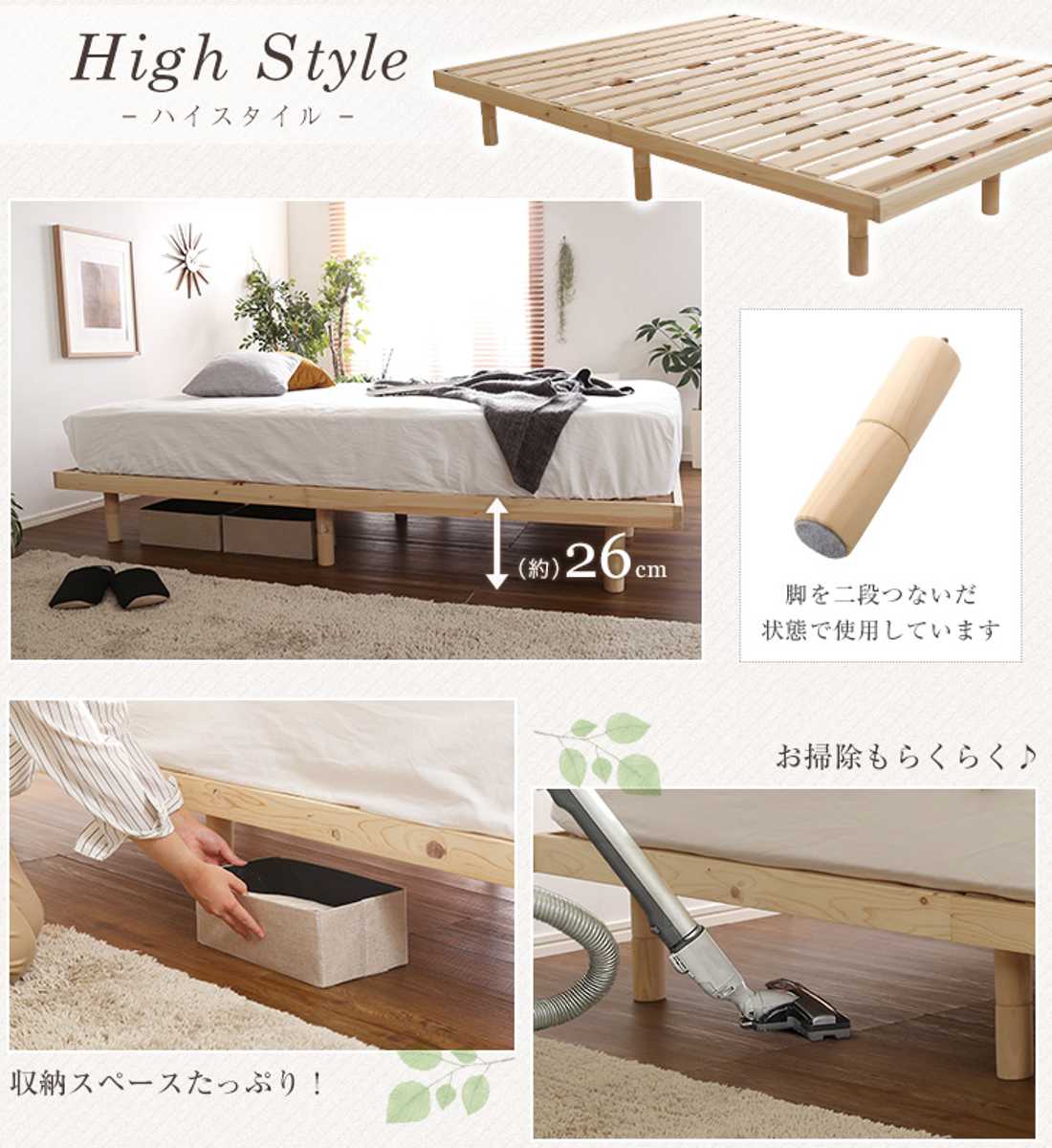 脚を2段つないだ状態で使用すると床面高26cmのハイスタイルになります。掃除がしやすく、ベッド下のスペースを収納スペースとして有効活用できます。
