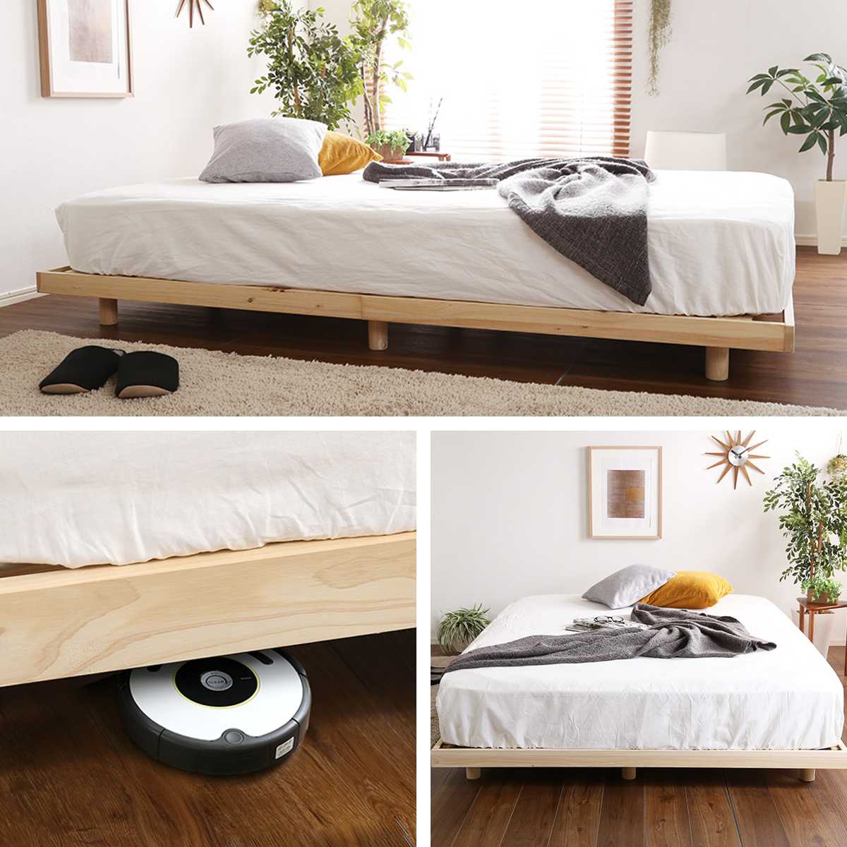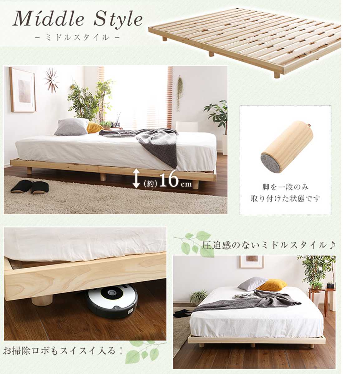 脚を1段のみ取り付けて使用すると床面高16cmのミドルスタイルになります。圧迫感がなく、部屋全体に開放感が生まれるので、スッキリした印象になります。お掃除ロボットも入るので、埃が溜まりがちなベッド下もキレイに掃除ができます。