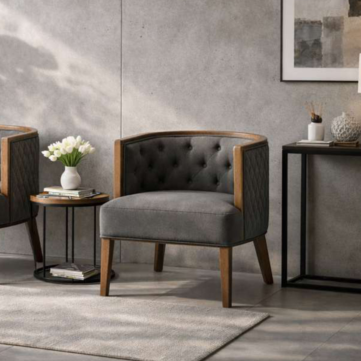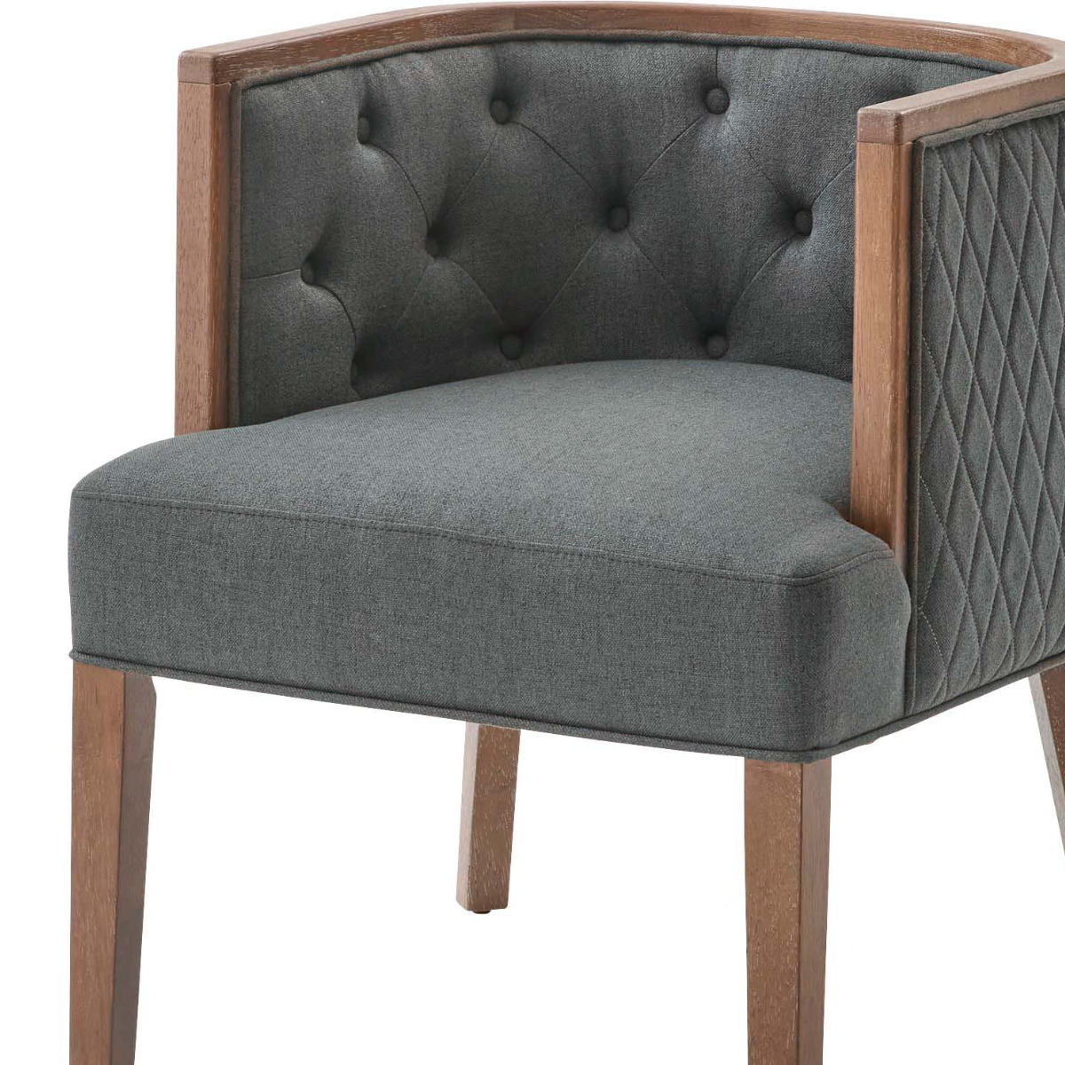 背面と側面に施されたキルティングとボタン留めが、クラシカルで洗練された印象に。置くだけでインテリアのアクセントになり、空間をぐっと引き締めます。