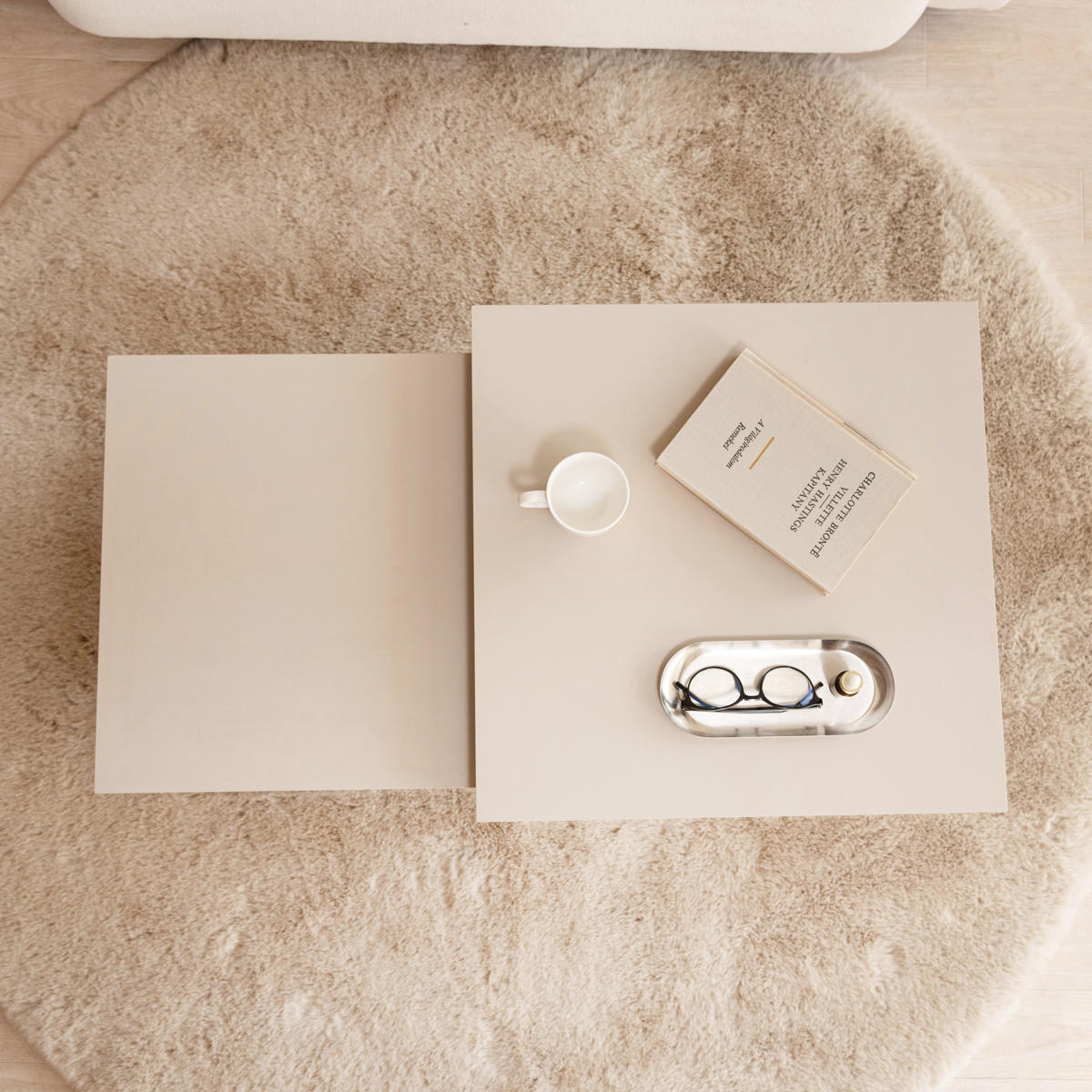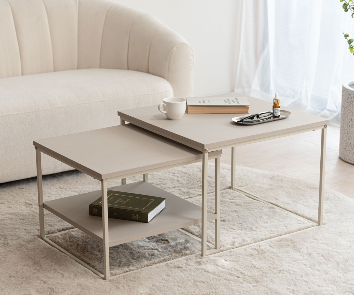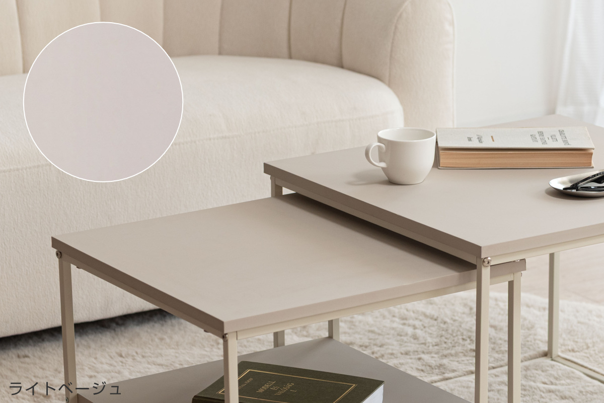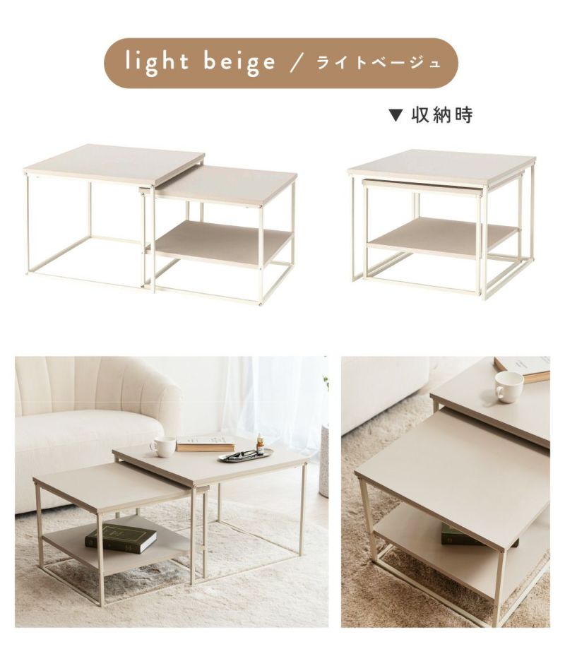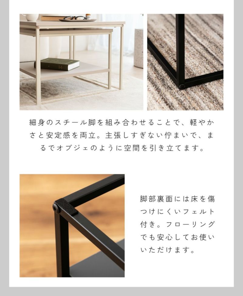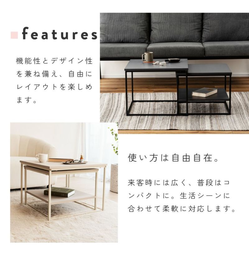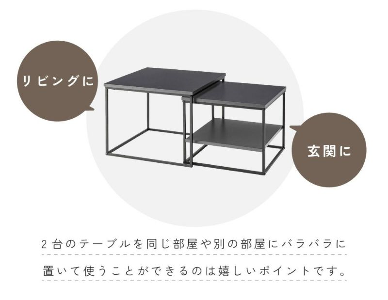 大小2台のテーブルは、並べて広々使ったり、重ねてコンパクトにしたりと生活シーンに合わせて柔軟に対応します。玄関やリビングなど別の部屋にバラバラに置くこともでき、自由なスタイルでレイアウトを楽しめます。