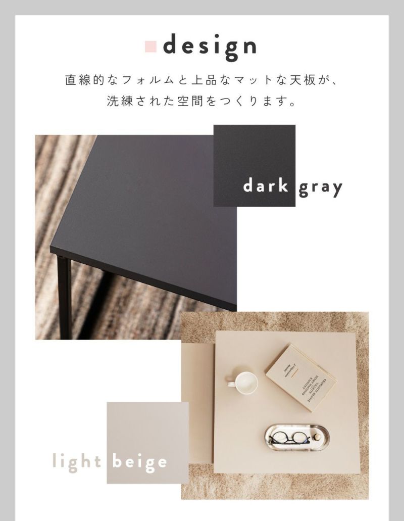 天板は光沢をおさえたマット仕上げです。反射が少ないため落ち着いた雰囲気を演出でき、空間全体を上品にまとめます。触れた時のさらっとした手触りも魅力です。