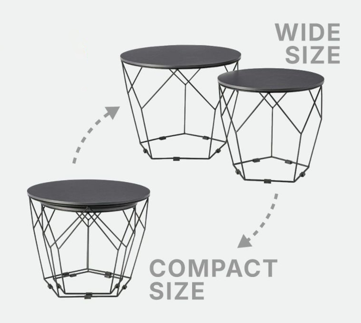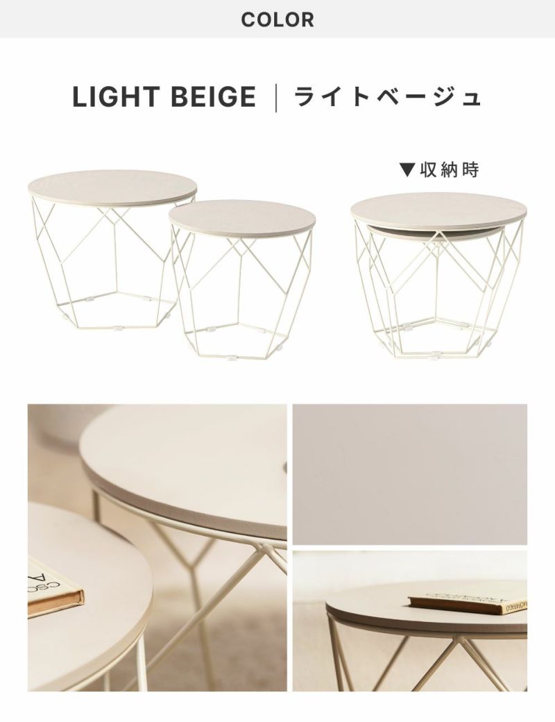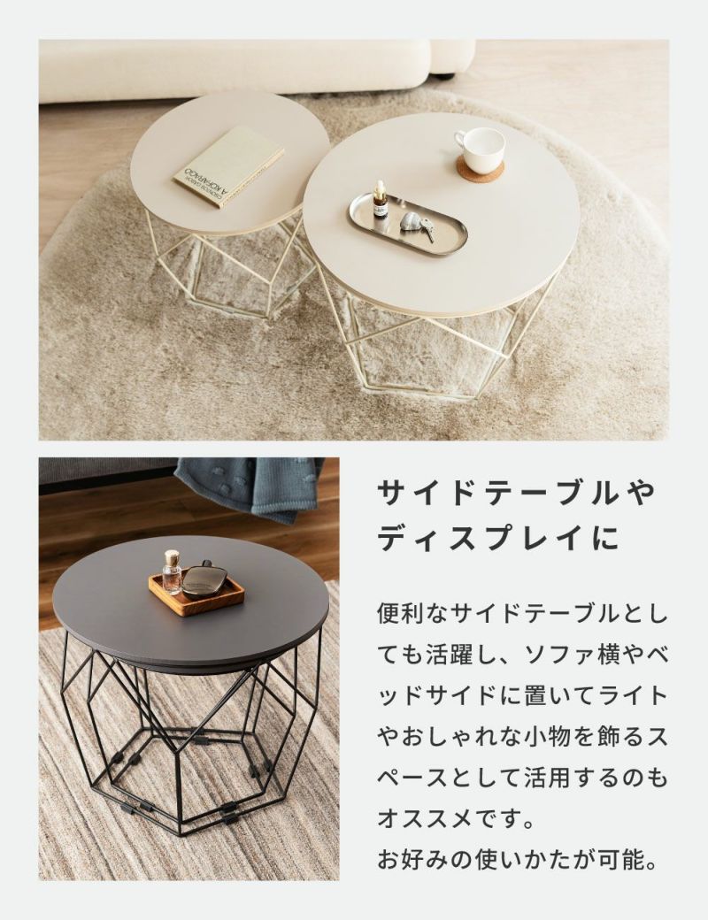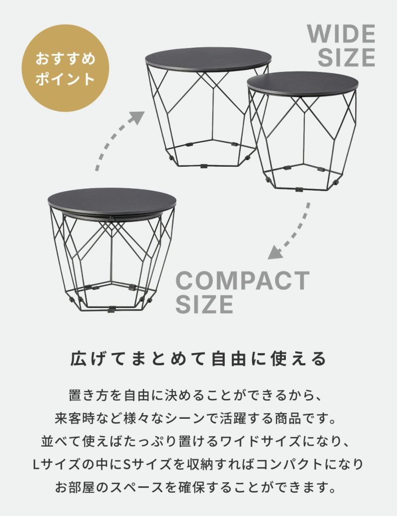大小2台のテーブルは置き方を自由に決めることができるので、来客時や作業など様々なシーンに対応します。並べて使えばたっぷり置けるワイドサイズになり、Lサイズの中にSサイズを収納すればコンパクトになりお部屋のスペースを確保できます。
