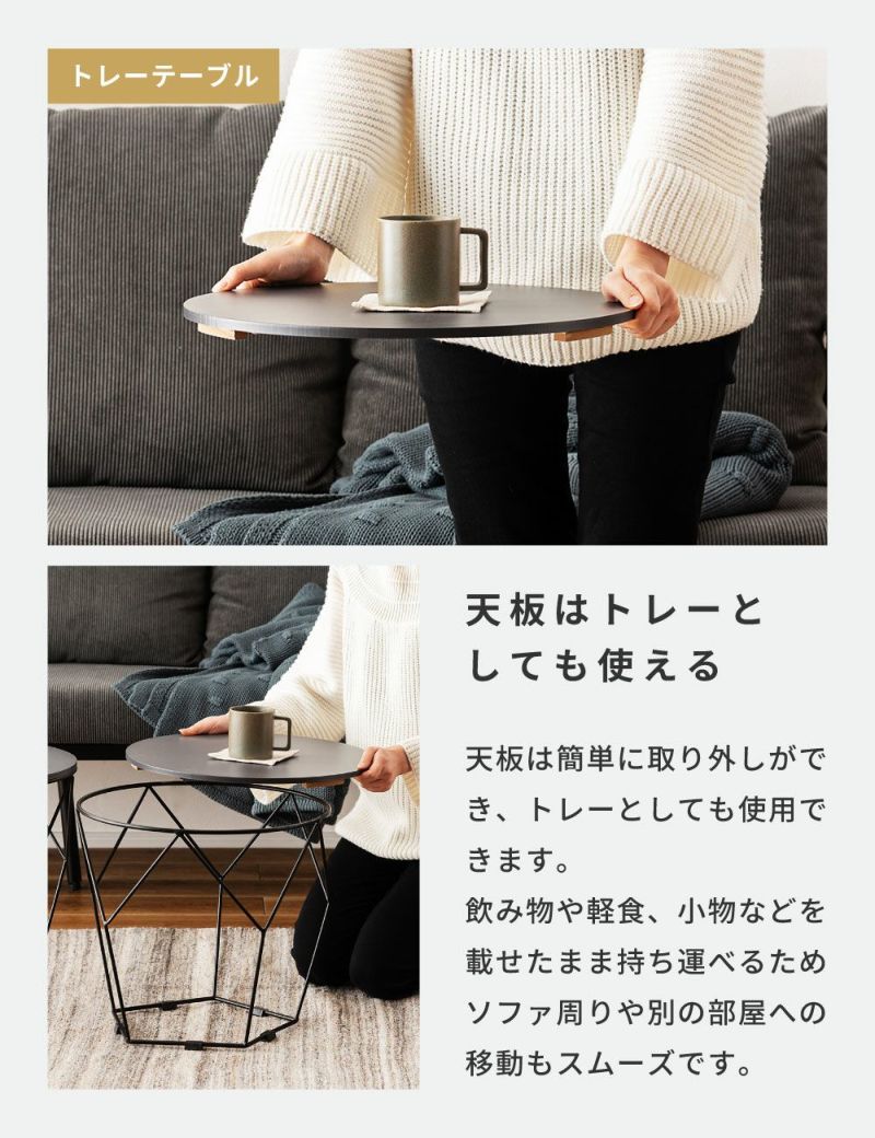 天板は簡単に取り外しができ、トレーとして使用できます。飲み物や軽食、小物などを乗せたまま持ち運べるため、ソファ周りや別の部屋への移動もスムーズです。