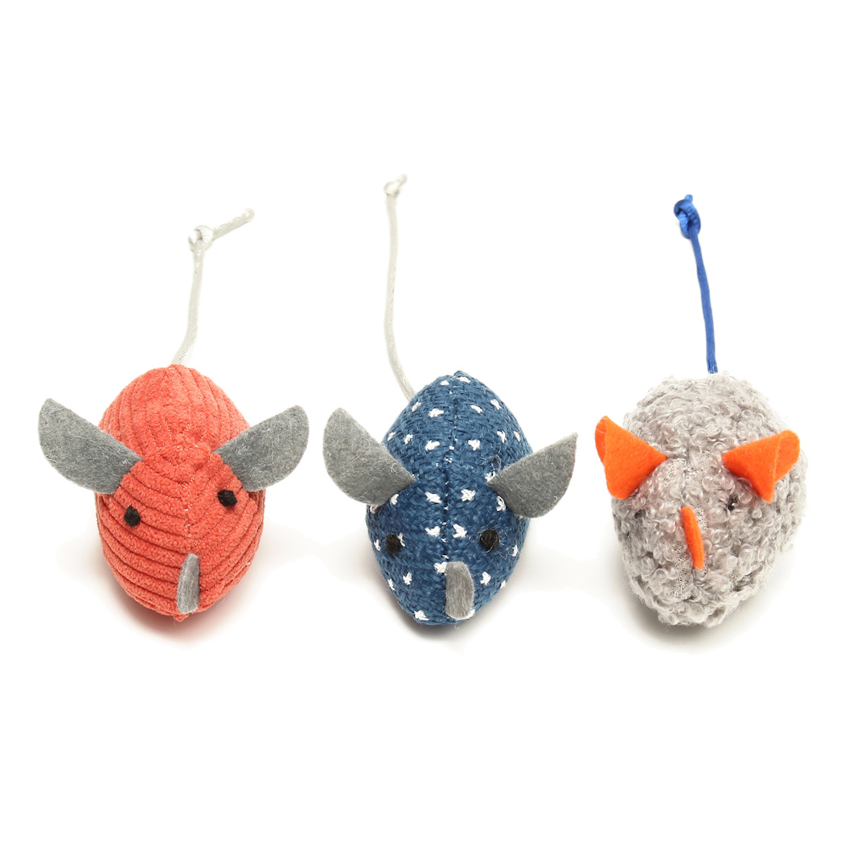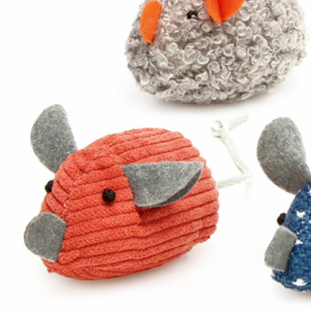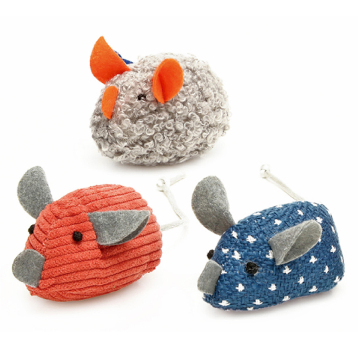 異なるカラーと質感が楽しめるマウスの3個組なので、気分や遊び方に合わせてローテーションができます。それぞれ織り方の異なる生地を使っているので、いろいろな感触を楽しめます。