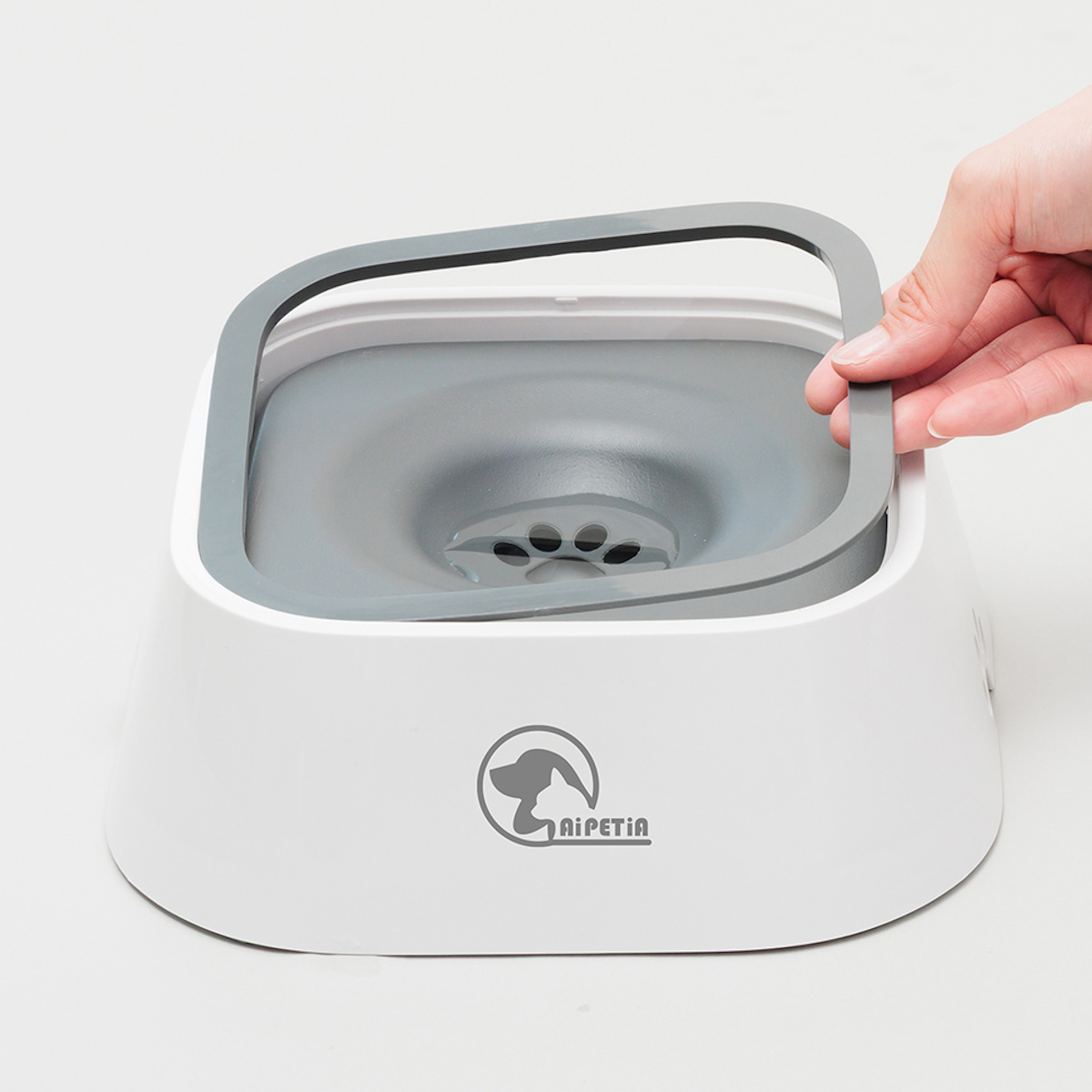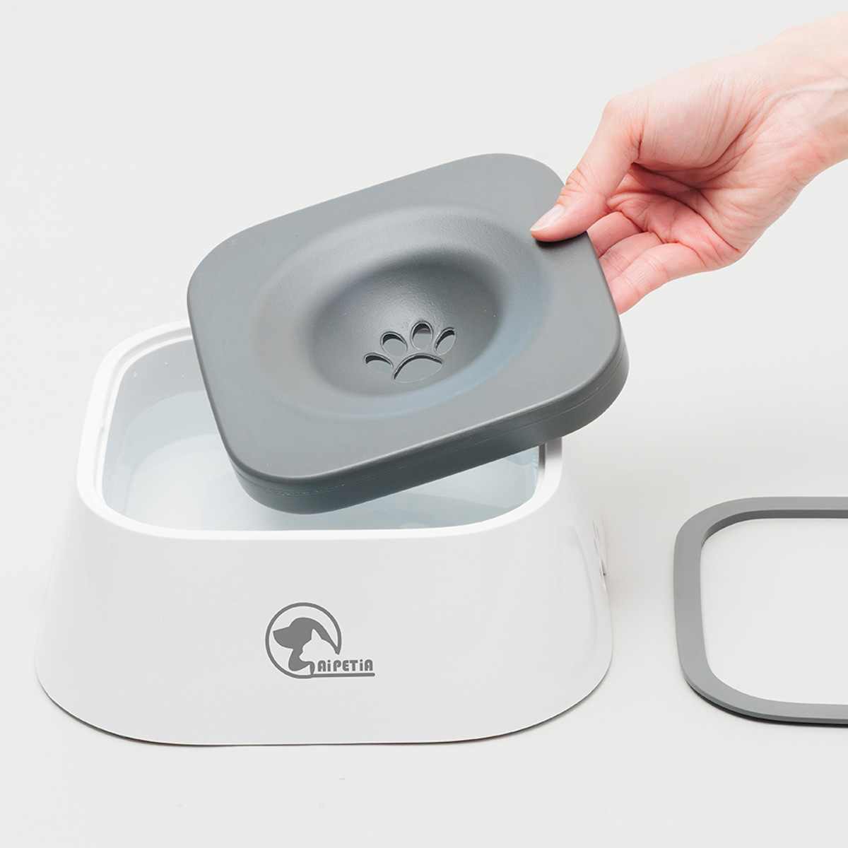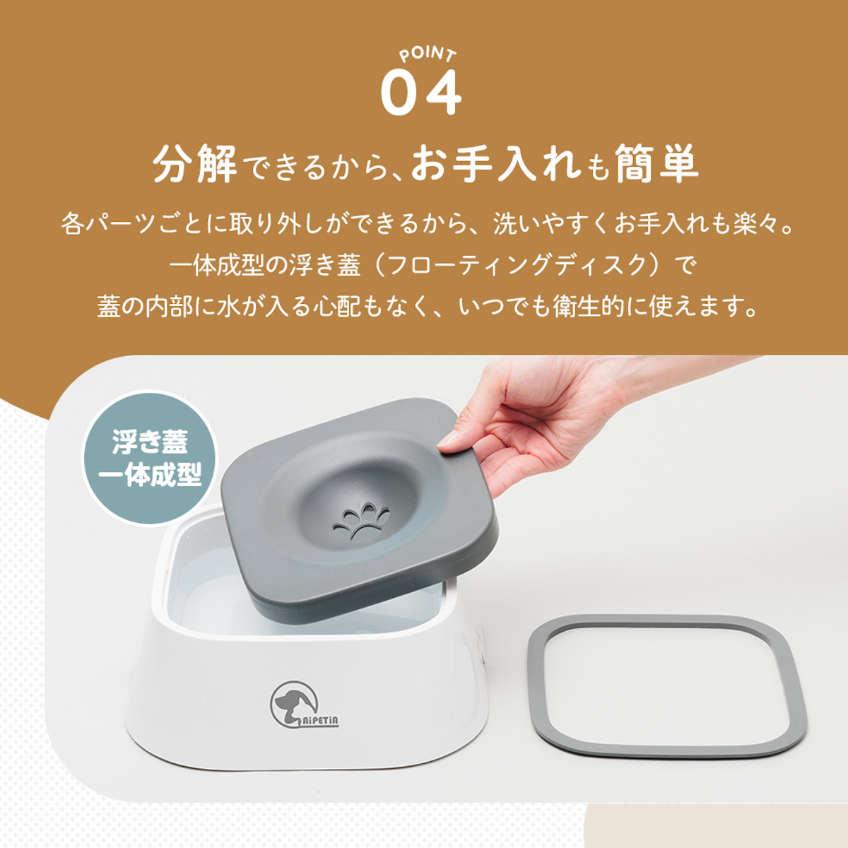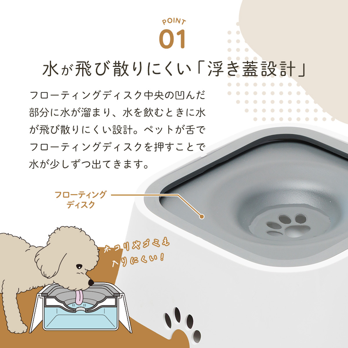 フローティングディスクの中央の凹んだ部分に水が溜まり、水を飲むときに水が飛び散りにくい設計です。ペットが舌でフローティングディスクを押すことで、水が少しずつ出てくる仕組みです。ホコリやゴミが入りにくいので衛生的です。