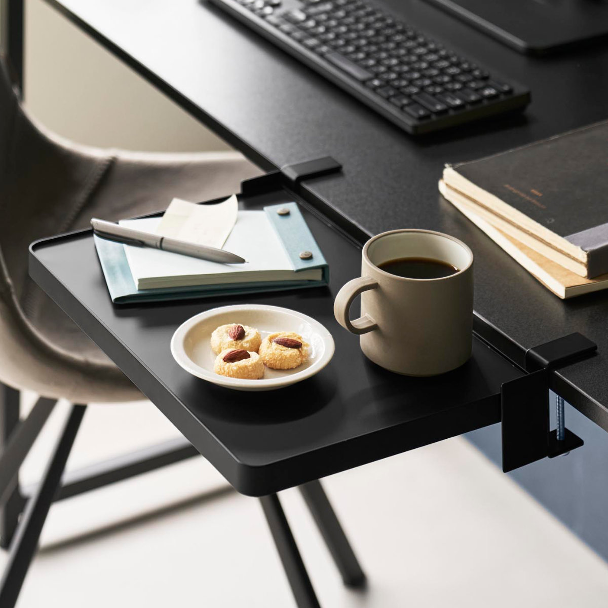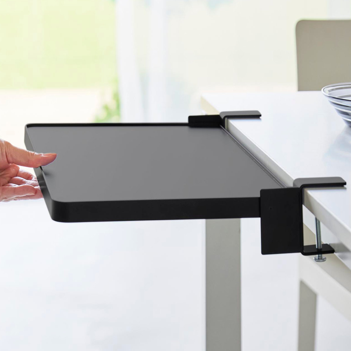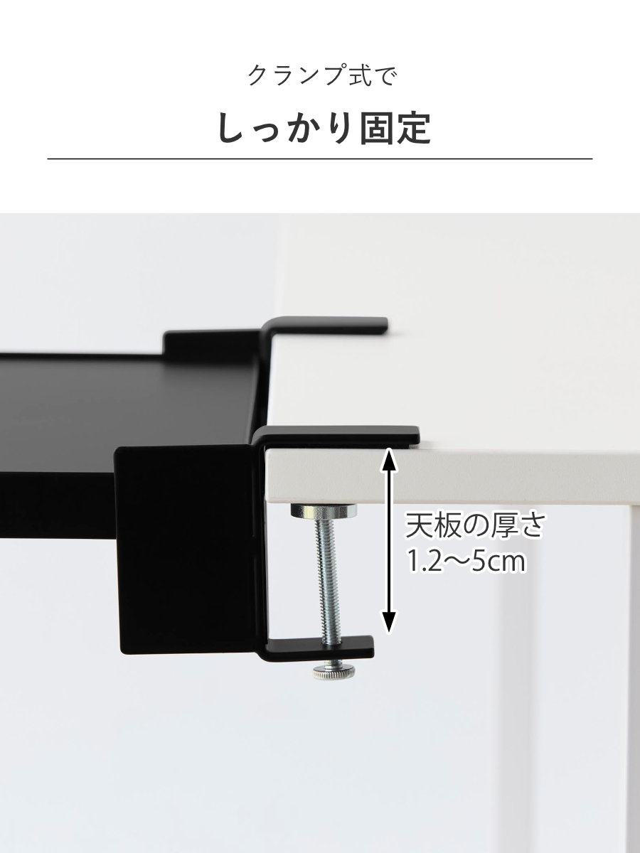 クランプ式でしっかりと挟んで固定できるため、ぐらつきにくく安定して使えます。ネジで締めるだけで簡単に取り付けられ、使用中も安心して物を置くことができます。