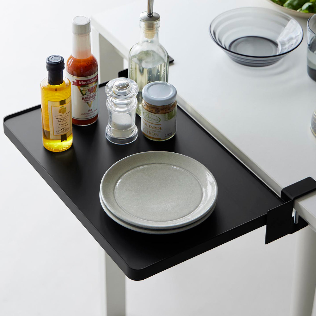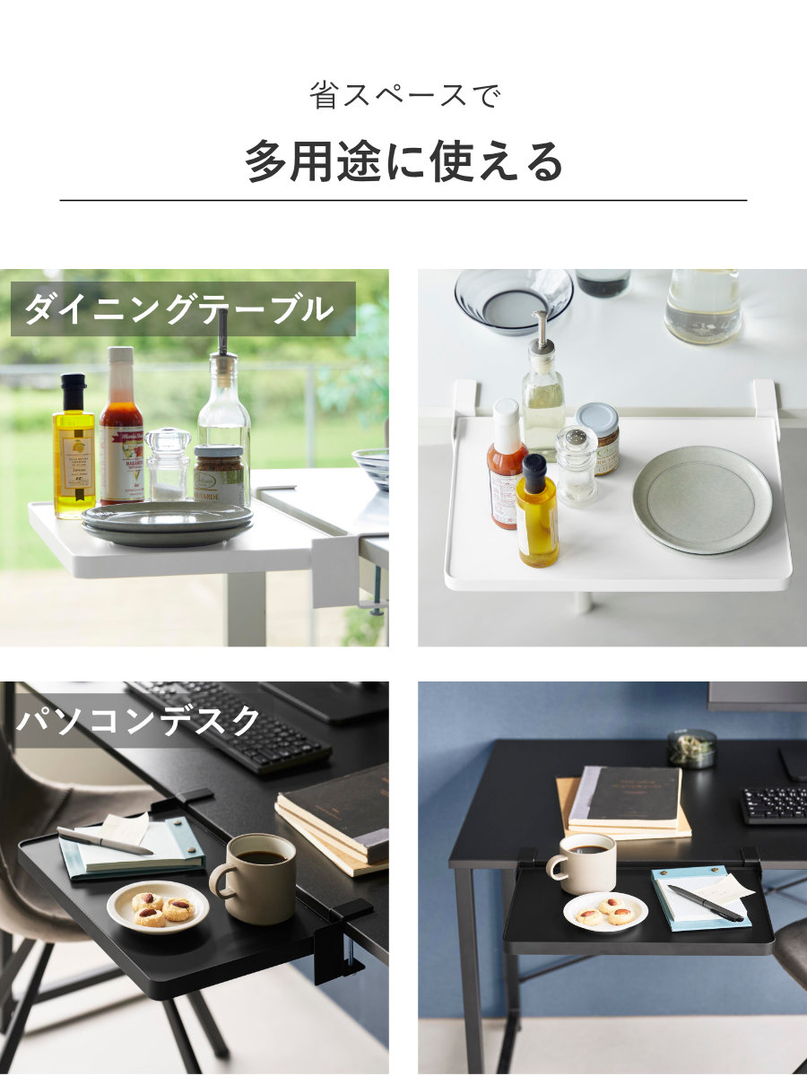 ダイニングでは、配膳準備や調味料の仮置きに便利です。パソコンデスクでは、作業中の資料や飲み物・おやつの一時置きとしても活躍します。