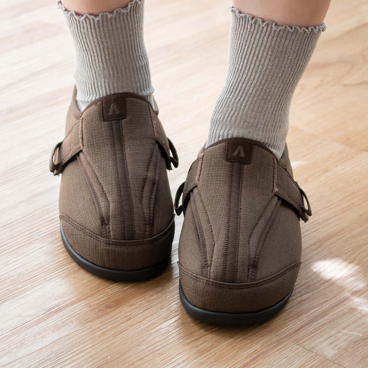足囲・足幅がゆったりした5Eサイズ相当なので、履いていて楽です。かかとがあるのでデイサービスでのご利用や入院時の上履きにも可能です。
