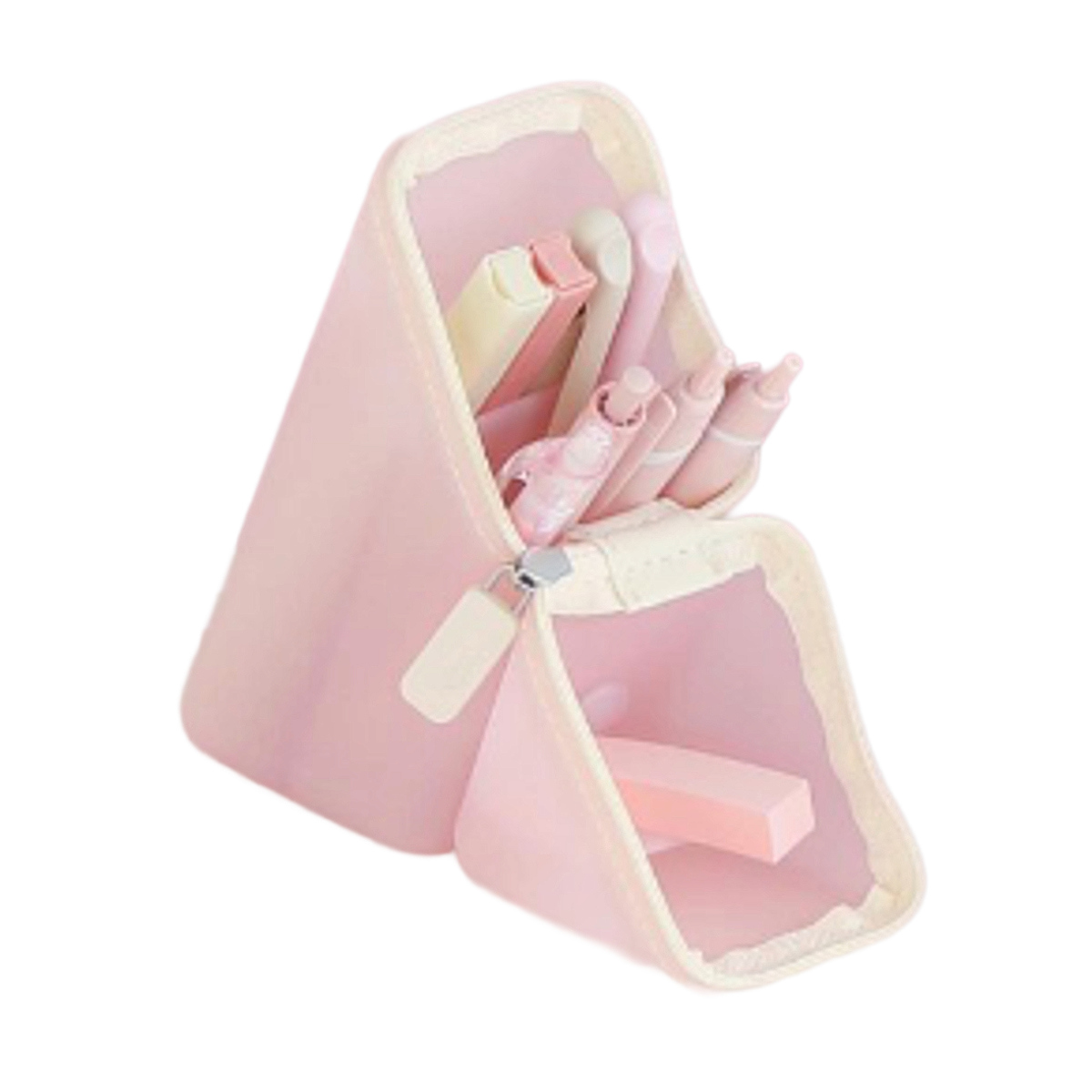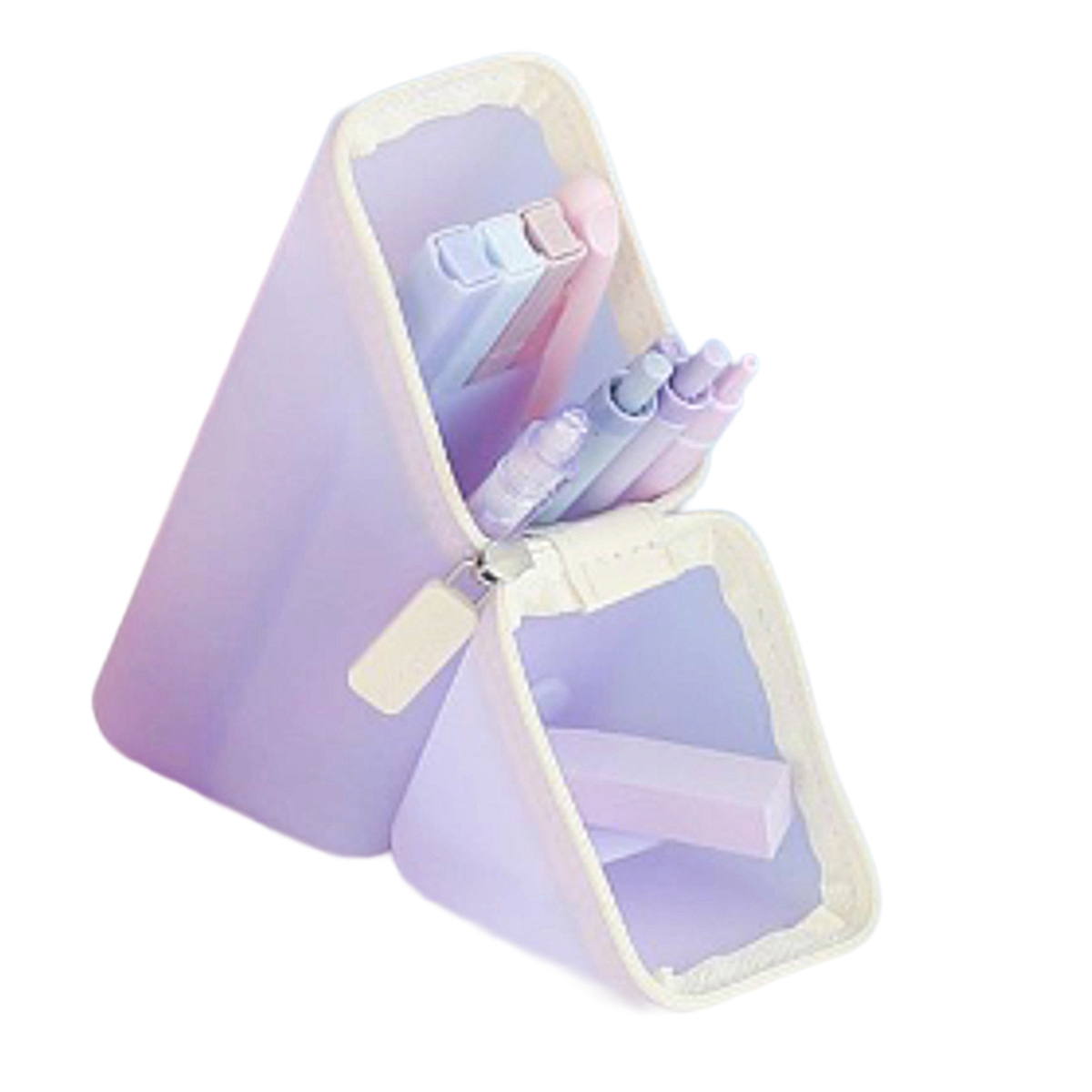 ケースは磁石で固定できる構造になっており、開くと三角形の形状で安定して自立します。机の上でしっかり立つため、ペンスタンドとして安心して使用できます。