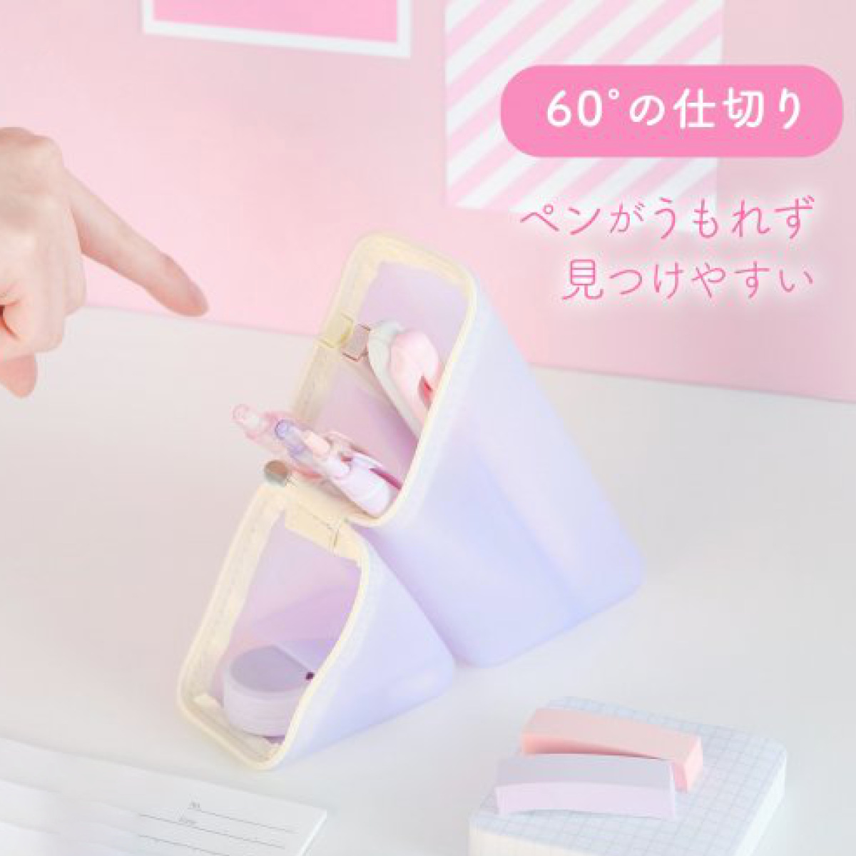内部には60度の傾斜仕切りがあり、ペンやマーカーが重なって埋もれるのを防ぎます。使用したい筆記具を素早く取り出せるため、作業の効率アップにつながります。