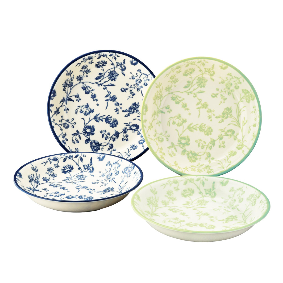ローラアシュレイのアーカイブにあるヴィンテージキルトに描かれていたロマンチックな小花柄デザインのパスタプレートセットです。バラ、カーネーション、ハニーサックルなどの模様をプリムラと組み合わせたスタイルがポイントの、ブルーやグリーンが爽やかで日常のライフスタイルに馴染みやすく使いやすいデザインです。
