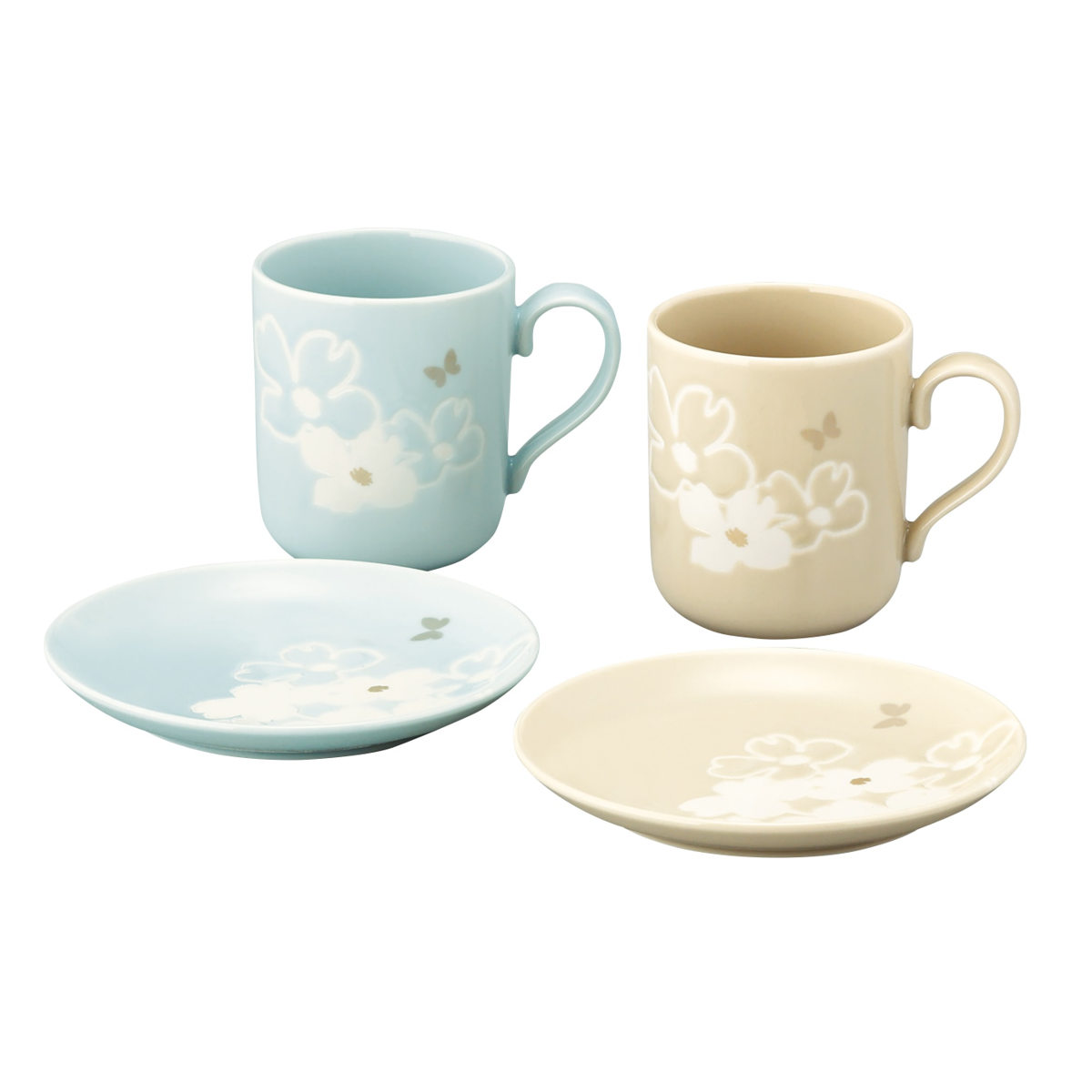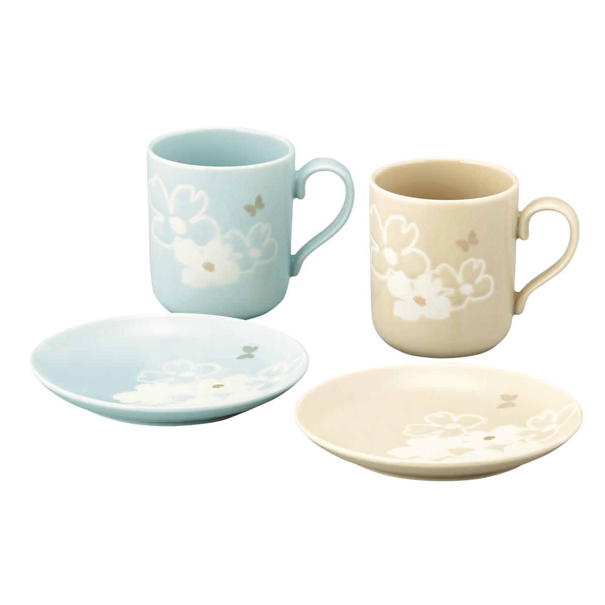 淡いベージュとブルーの色釉で花をモチーフにした、上品でやさしいデザインのフルールシリーズのモーニングペアセットです。主張しすぎず、料理を引き立てるデザインで幅広い年代に好まれる落ち着いた華やかさが魅力です。ご夫婦やご家族での日常使いはもちろん、大切な方への贈り物にもおすすめです。