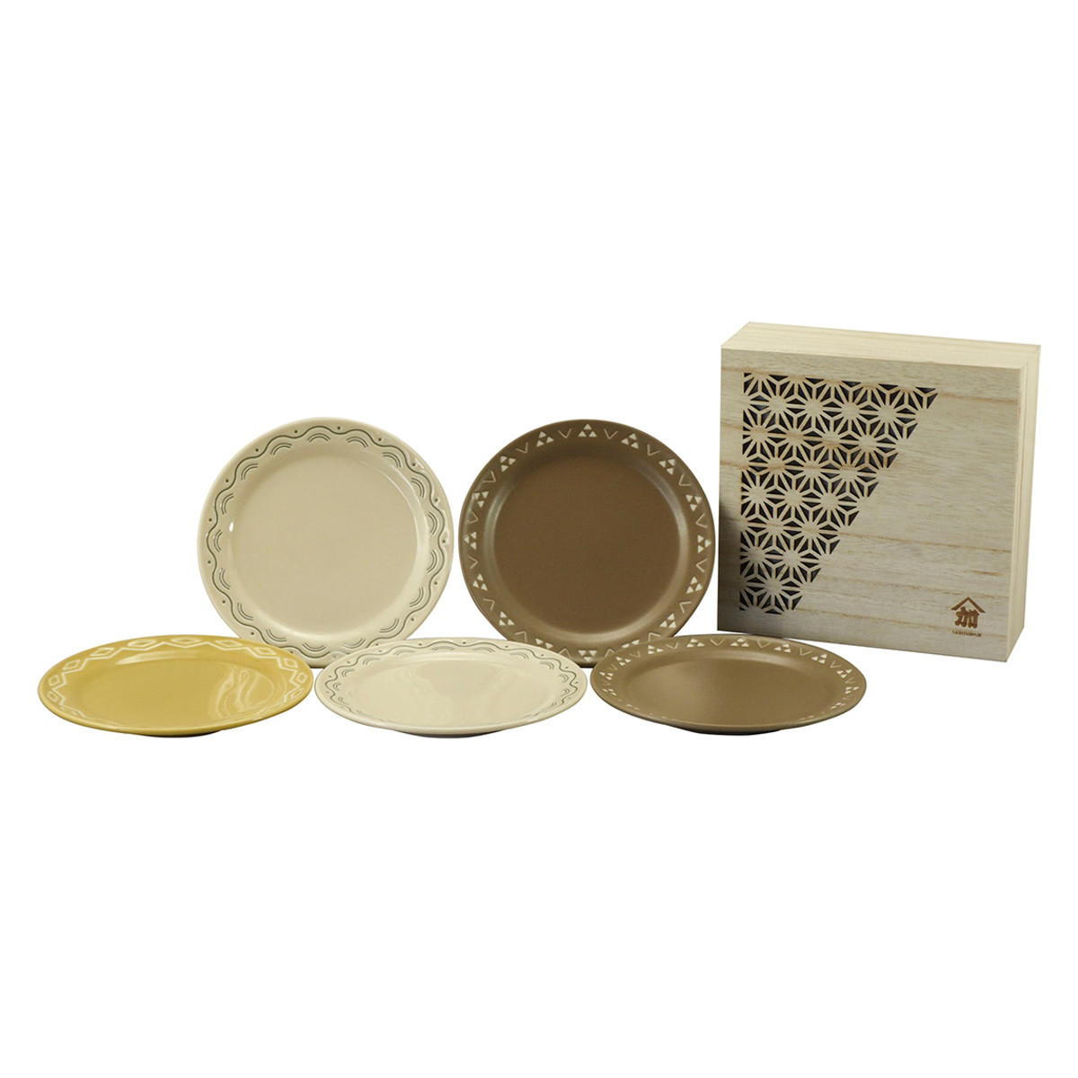 3種類の和柄(青海波、菱紋、鱗紋)を食器として使いやすいようにアレンジした「komon」シリーズのプレート5枚セットです。昔から伝わる伝統的な和柄には、各柄に祈りや想いが込められています。シックな色合いとシンプルなデザインは年齢を問わずお使いいただけます。木箱入りなので贈り物にもおすすめです。
