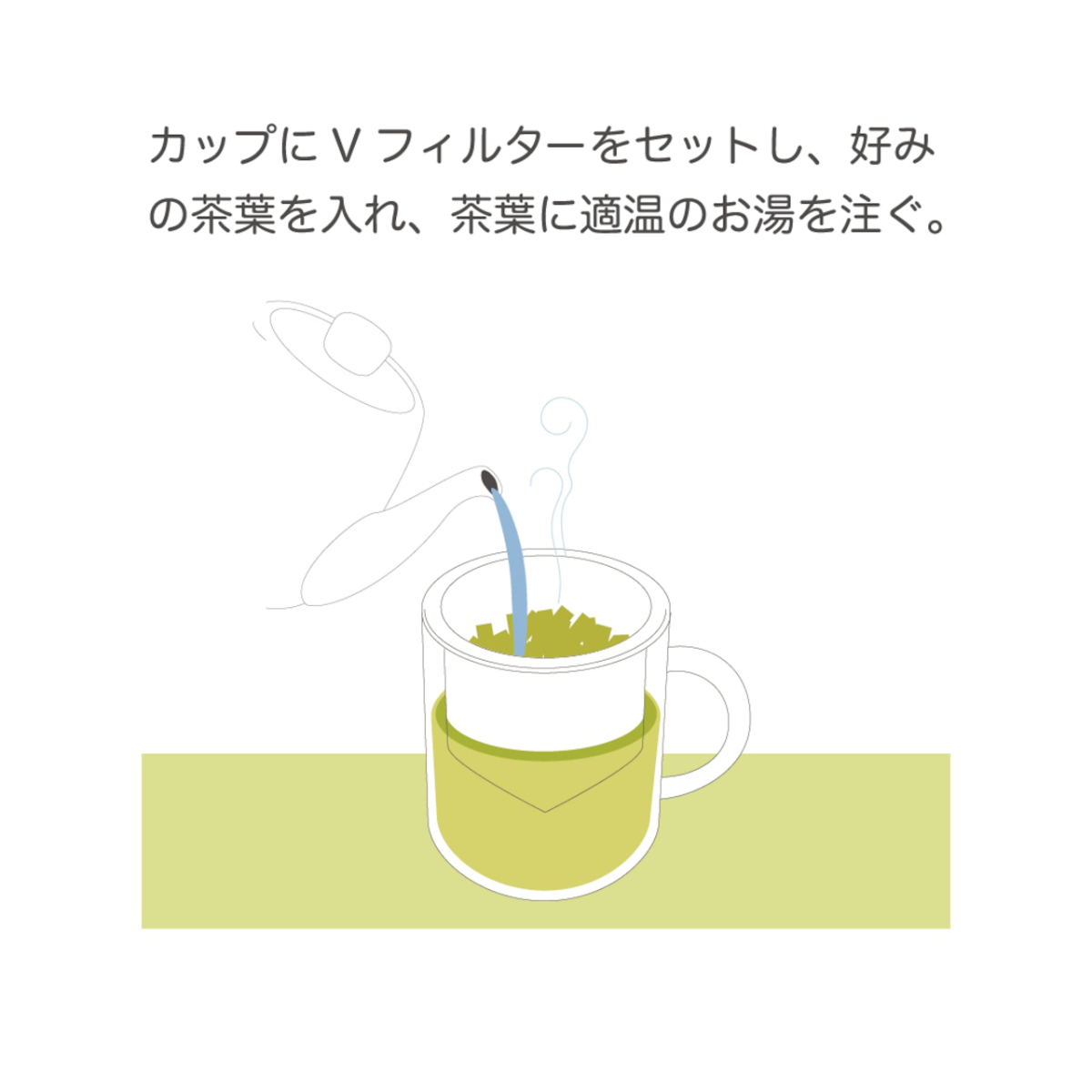 カップにVフィルターをセットし、好みの茶葉を入れ、茶葉に適温のお湯を注ぐ。