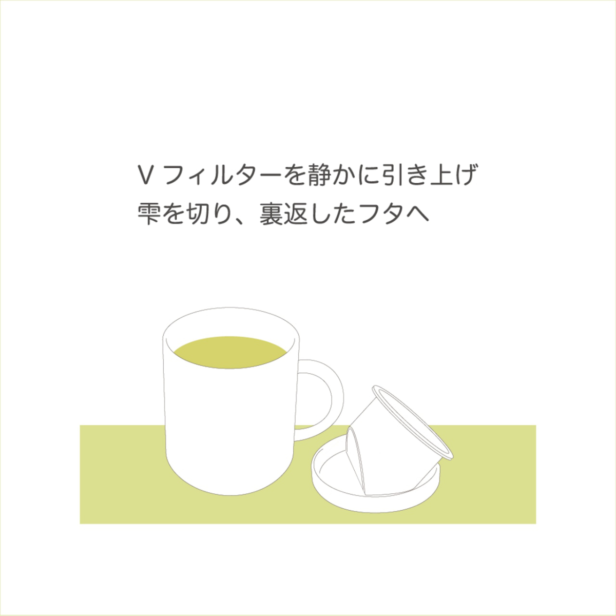 カップにVフィルターをセットし、好みの茶葉を入れ、茶葉に適温のお湯を注ぐ。