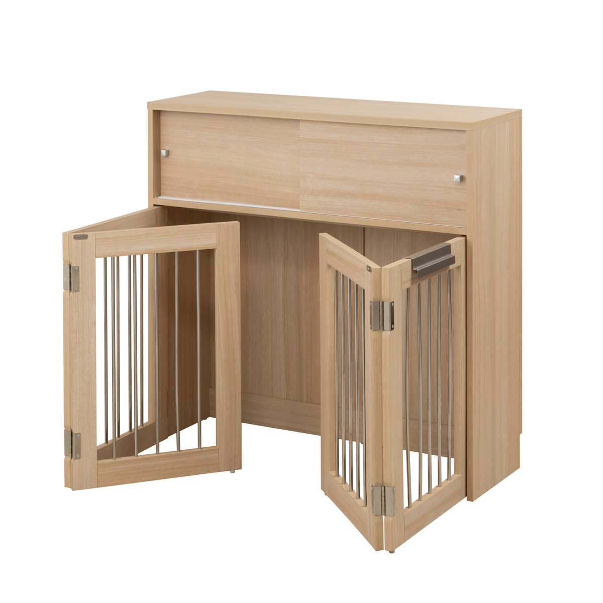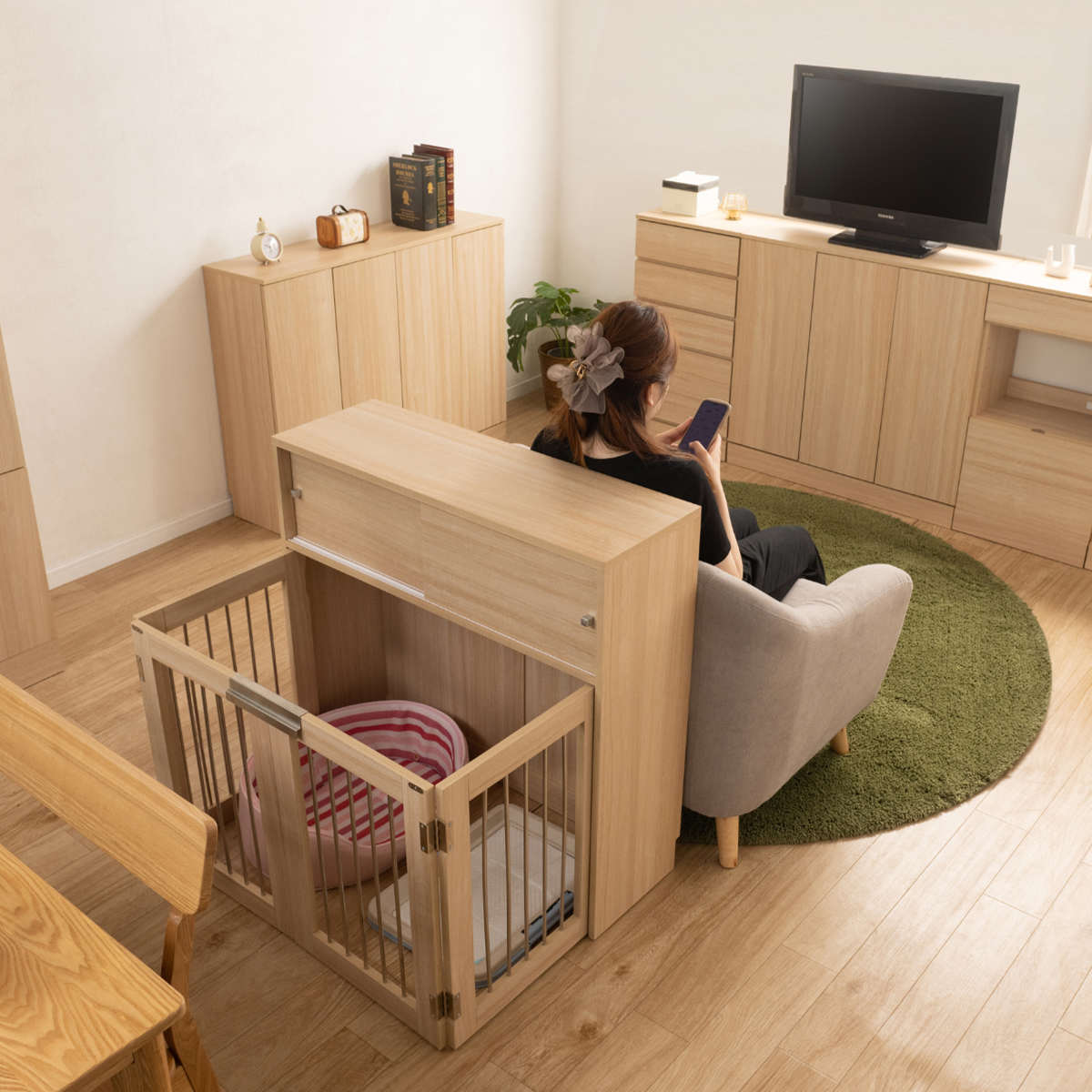 わんちゃんが入る時だけ扉を広げて使用できます。使わない時には収納キャビネットとしてインテリアに溶け込みます。愛犬とのふれあい時間を広々したスペースで楽しめます。