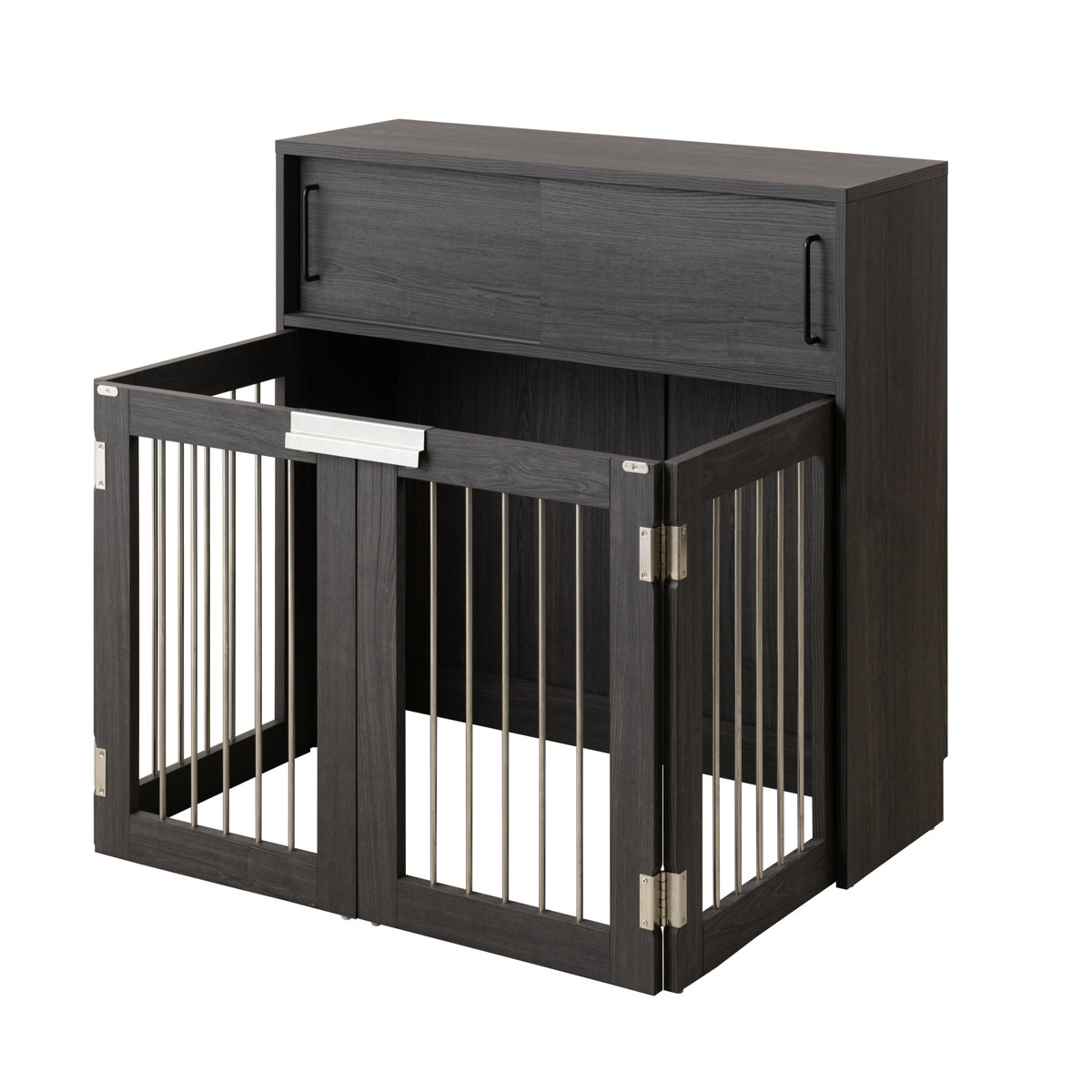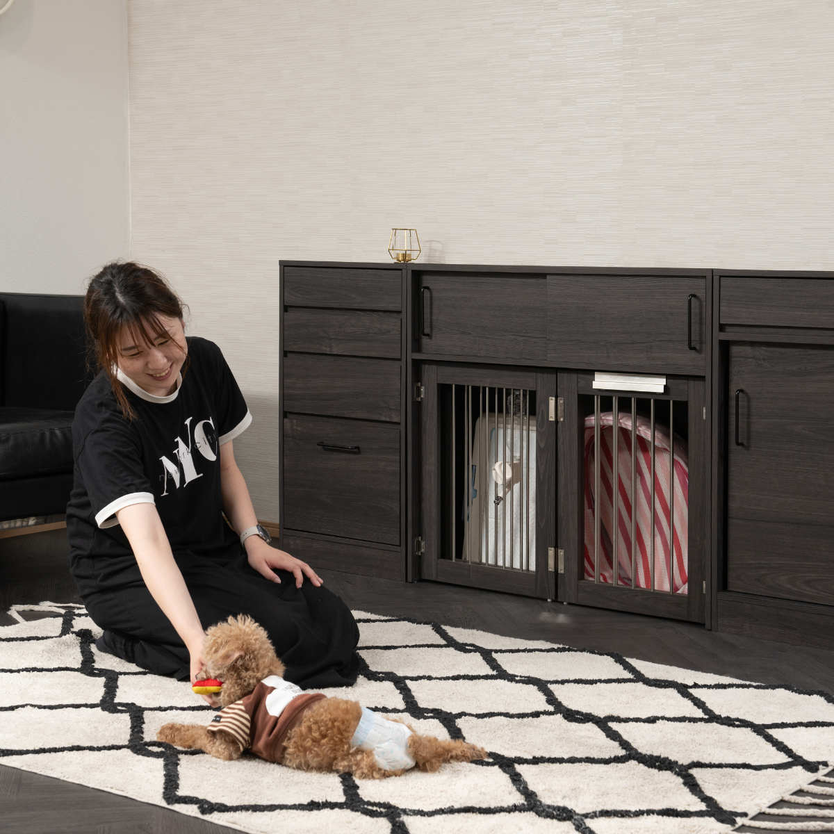 わんちゃんが入る時だけ扉を広げて使用できます。使わない時には収納キャビネットとしてインテリアに溶け込みます。愛犬とのふれあい時間を広々したスペースで楽しめます。