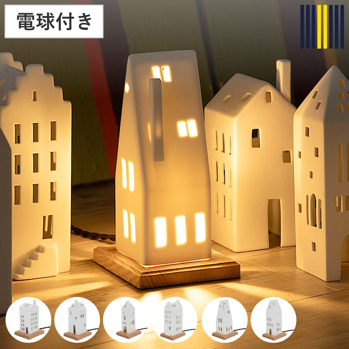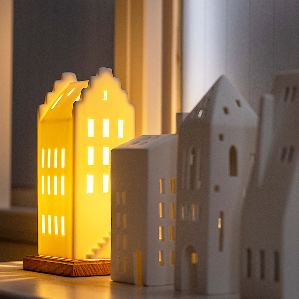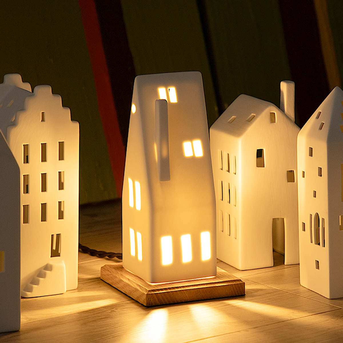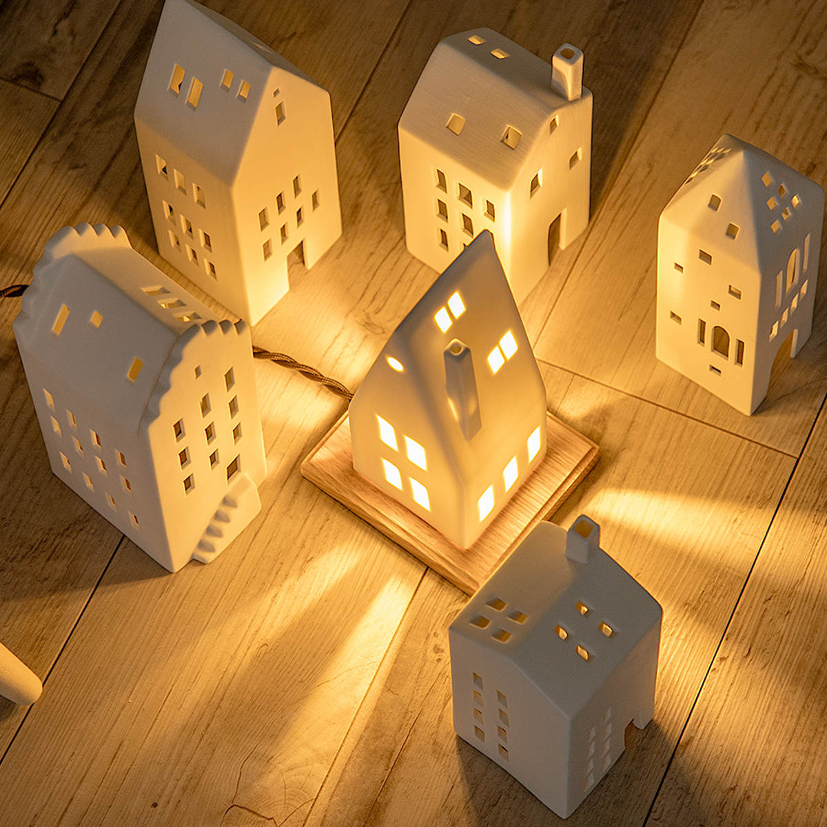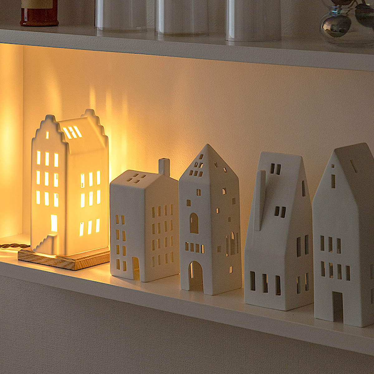 窓から漏れる温かな光は、まるで夕暮れ時の街角のよう。並べて飾れば、小さな北欧の街並みが生まれます。