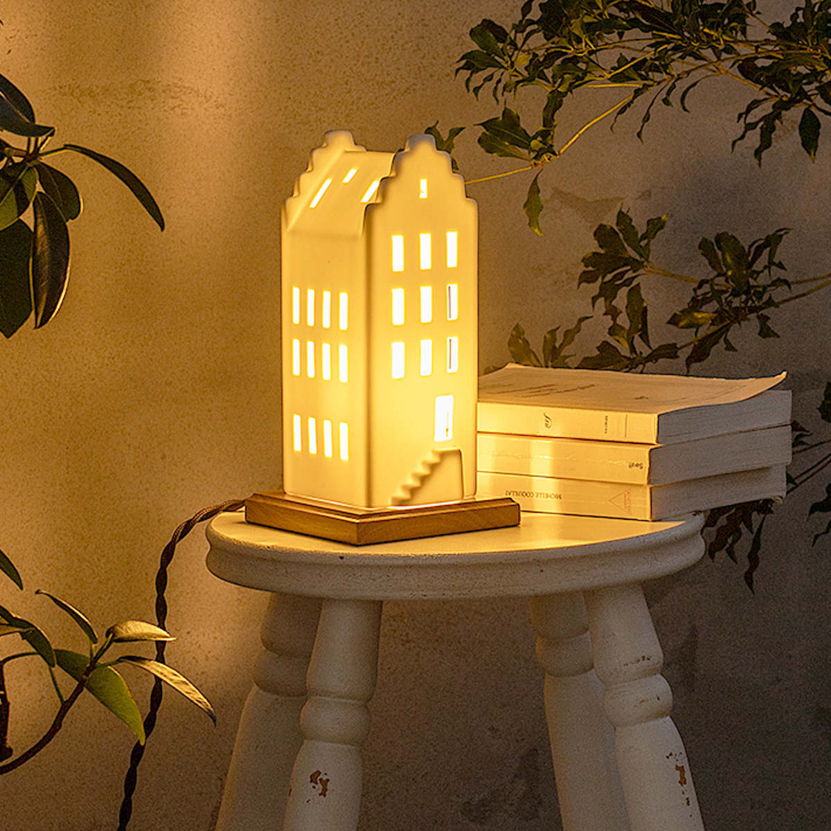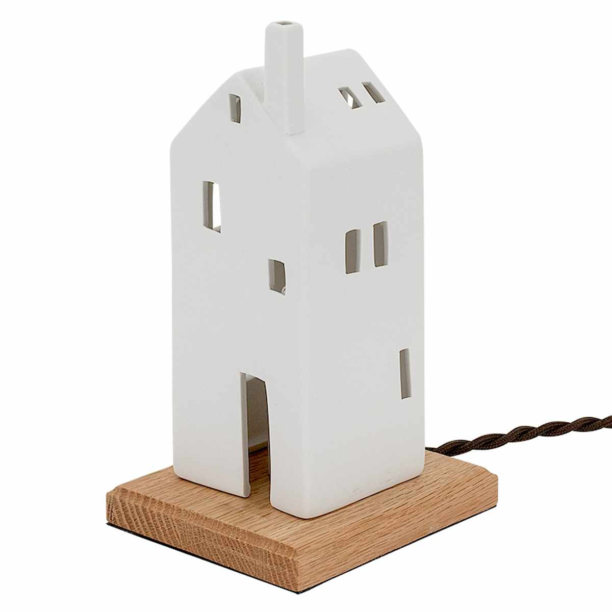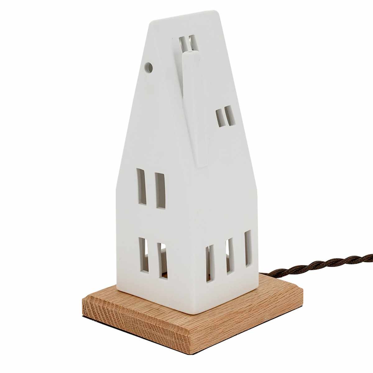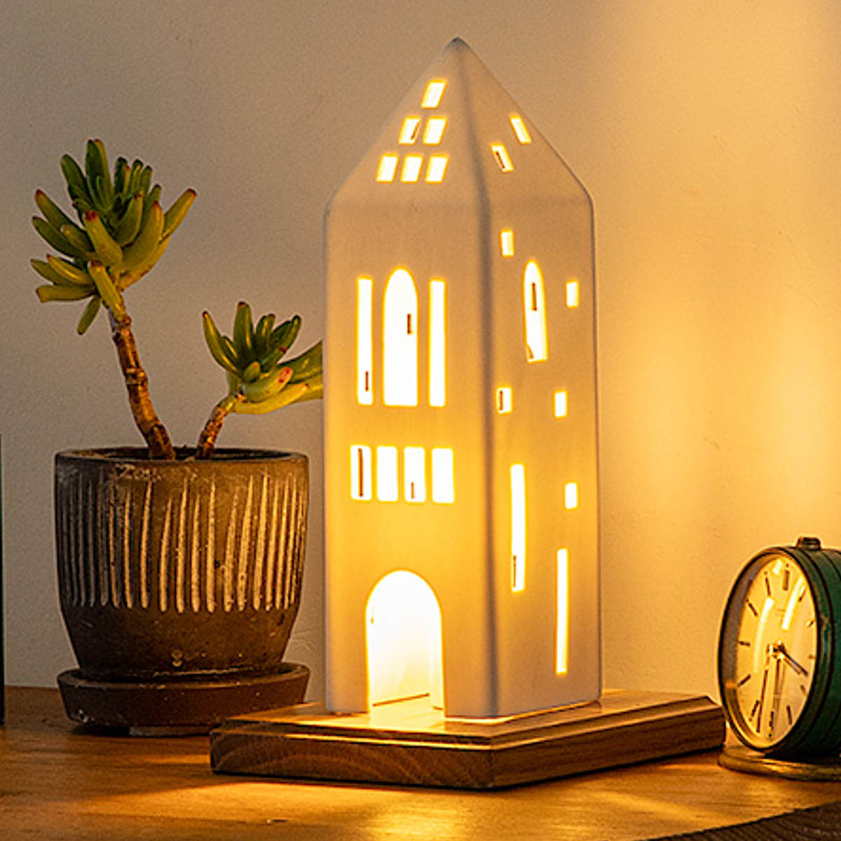 北欧風の家をモチーフにした白い磁器製のテーブルライト。シンプルでありながら温かみのあるデザインは、どんな空間にも自然に溶け込み、柔らかな光で癒しの雰囲気を創出します。