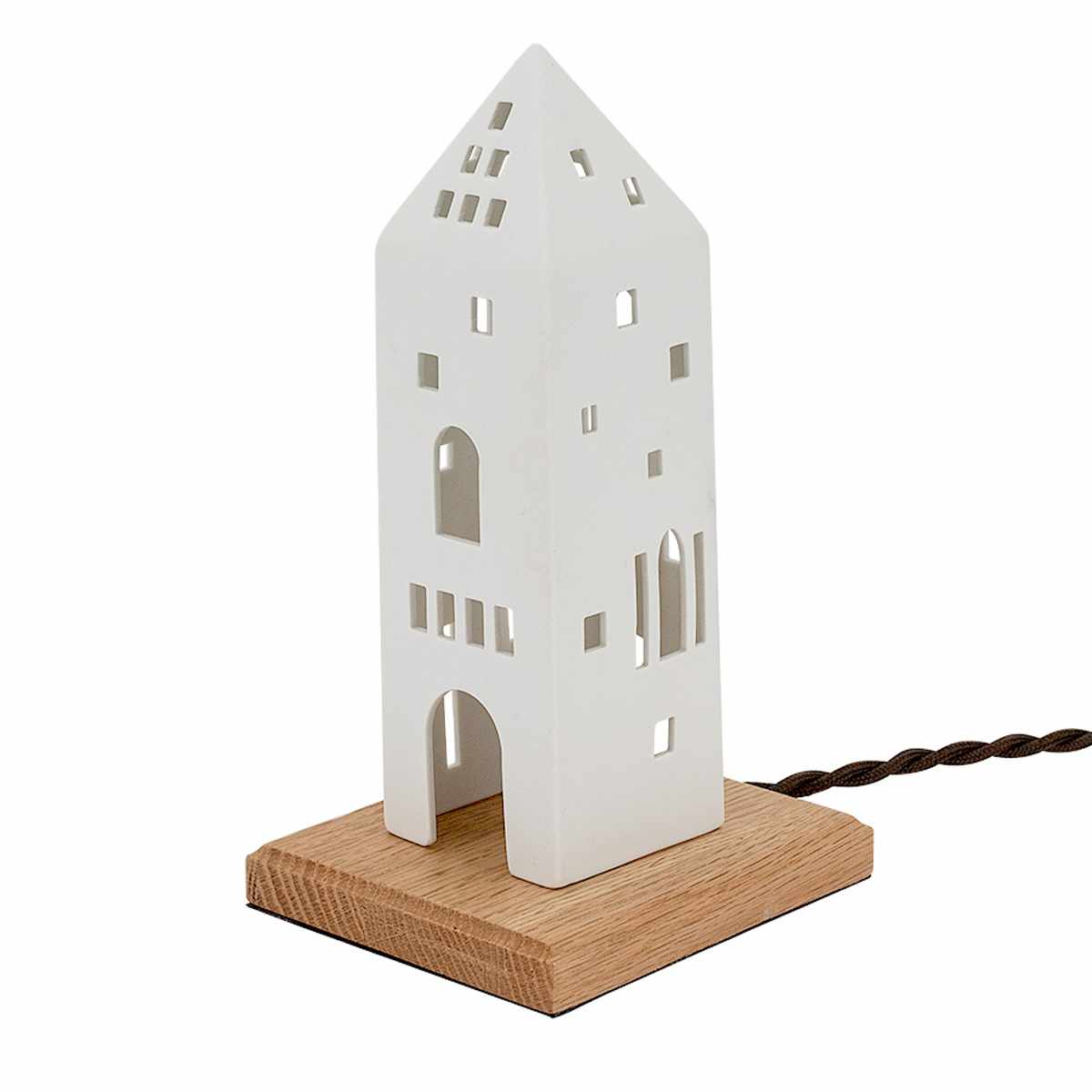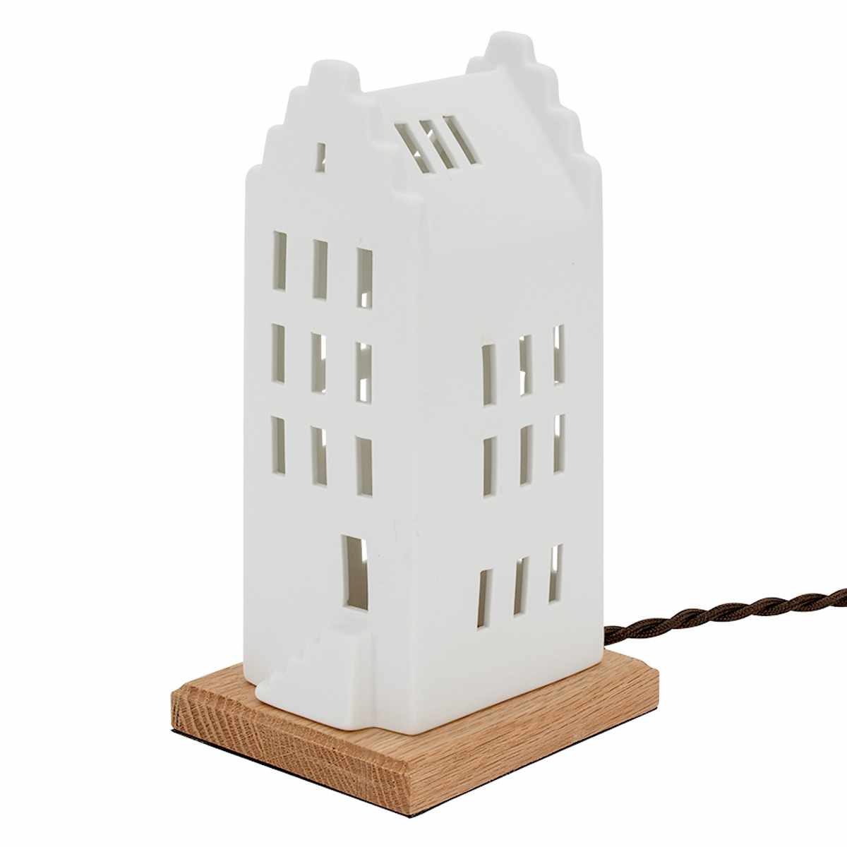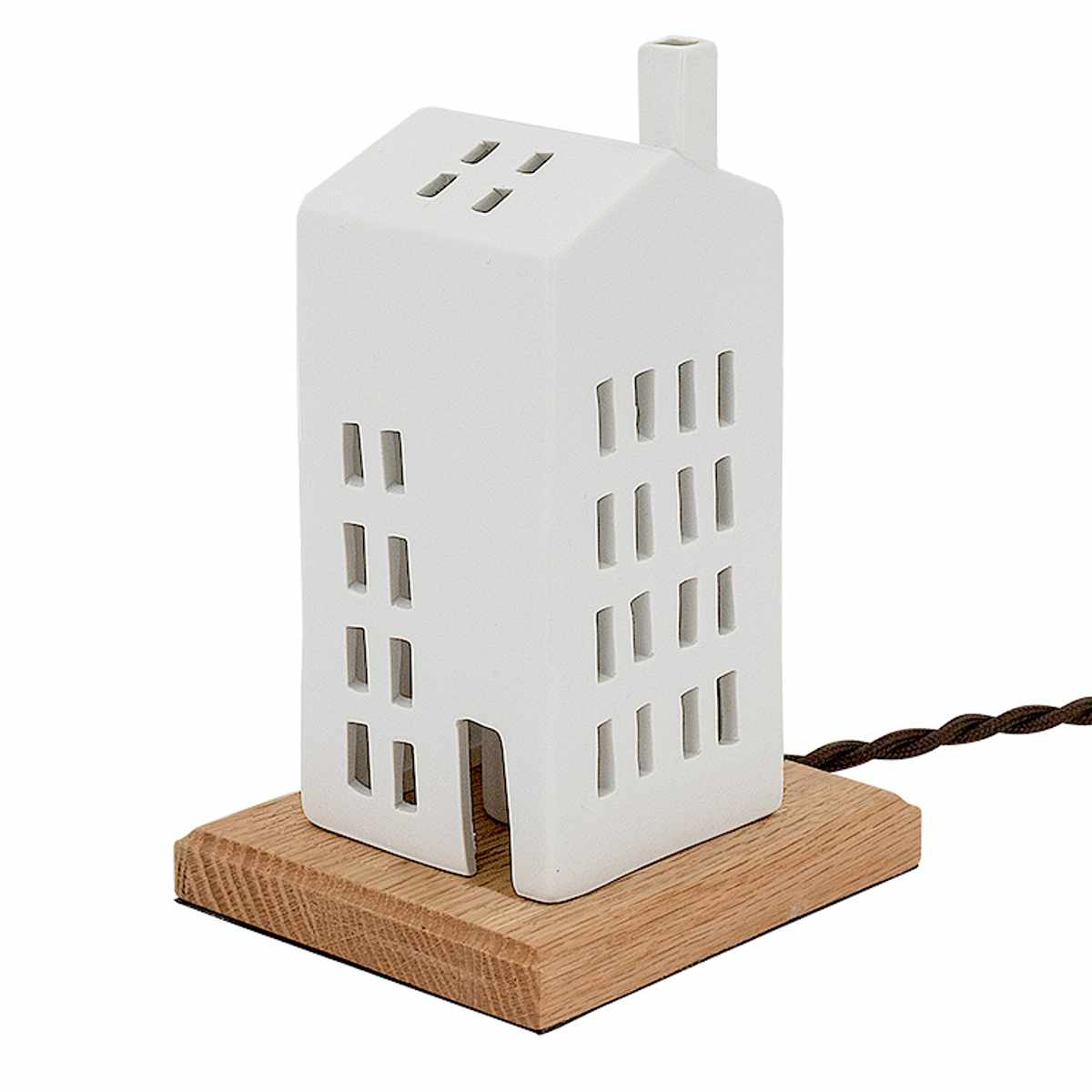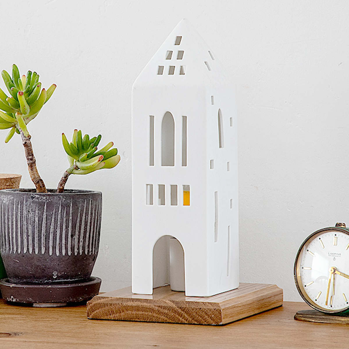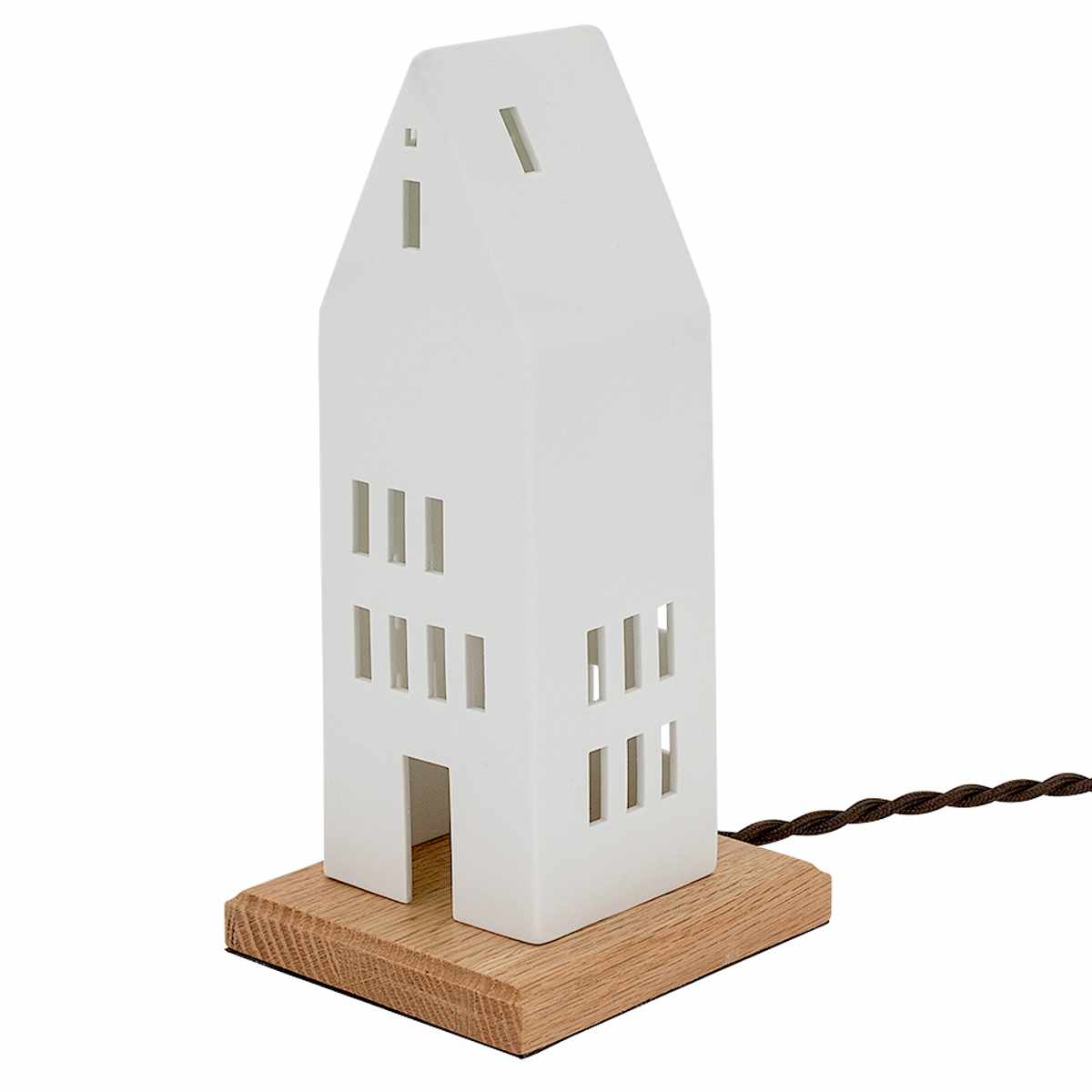 北欧風の家をモチーフにした白い磁器製のテーブルライト。シンプルでありながら温かみのあるデザインは、どんな空間にも自然に溶け込み、柔らかな光で癒しの雰囲気を創出します。