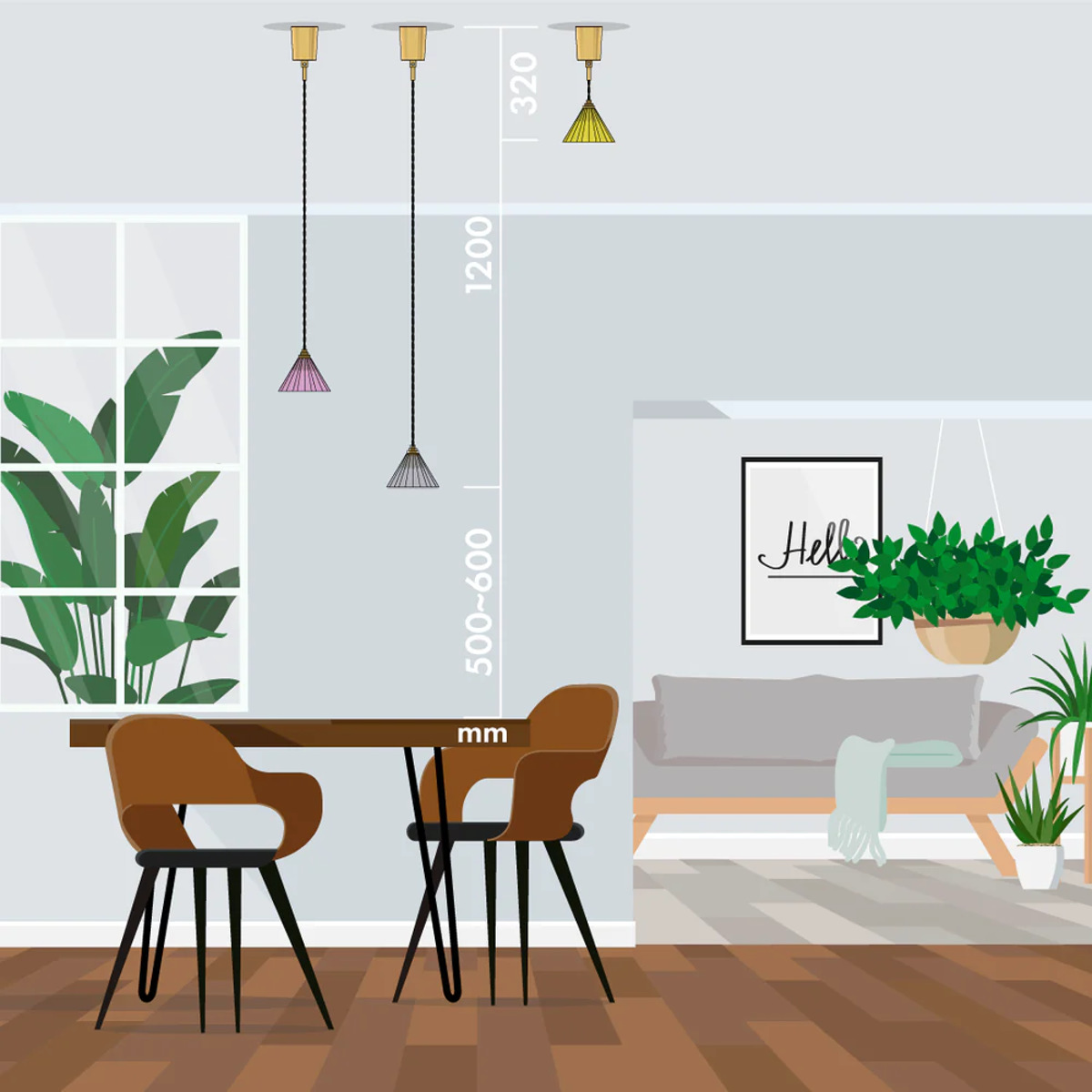 全高(天井からランプの下まで)は1.2m。コードの長さは調節可能で、約32cmまで短くできます。短くしたコードはフランジカバー内に収まるので見た目もスッキリします。