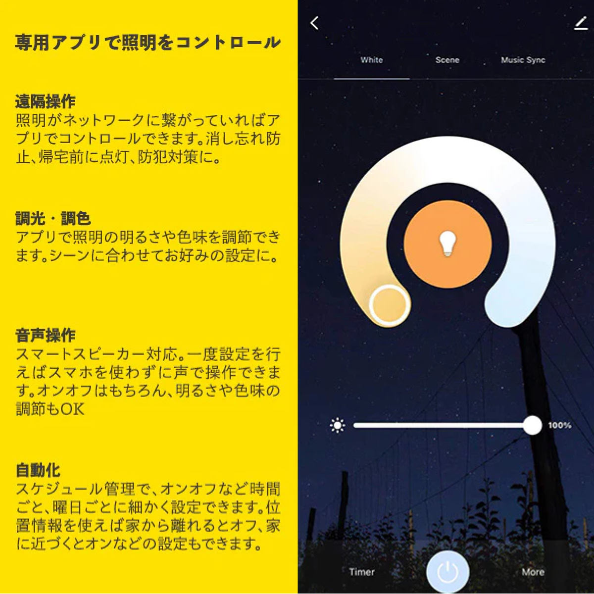 | 備考 | 【機能】 ・調光・調色機能 ・メモリー機能 ・タイマー機能 ・専用アプリに対応 ※アプリをご利用いただくには、Wi-Fi環境が必要です。 ※本アプリは2.4GHzのWi-Fiのみ対応しています。 ※5GHzのWi-Fiでご利用の場合は、2.4GHzのネットワークに切り替えてからアプリの設定を行ってください。 ※照明器具の追加設定が完了した後は、Wi-Fiを5GHzに戻してご使用いただけます。 【仕様】 ・全光束:390ルーメン(アプリ、別売リモコンで~440ルーメンまで調節可) ・消費電力:8.7ワット ・色温度:2700ケルビン(アプリ、別売リモコンで~6500ケルビンまで調節可) ・点灯方法:プッシュスイッチ、専用リモコン(別売) ・定格寿命:約20,000時間 ※LED一体型のためLED交換は出来ません ※1日6時間の点灯で約3,300日使用できます |